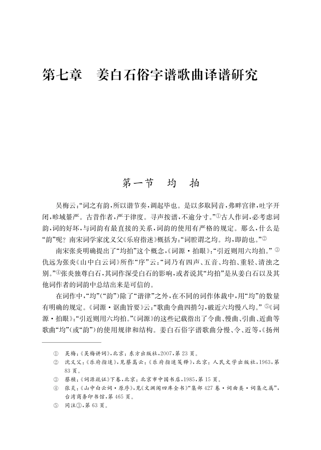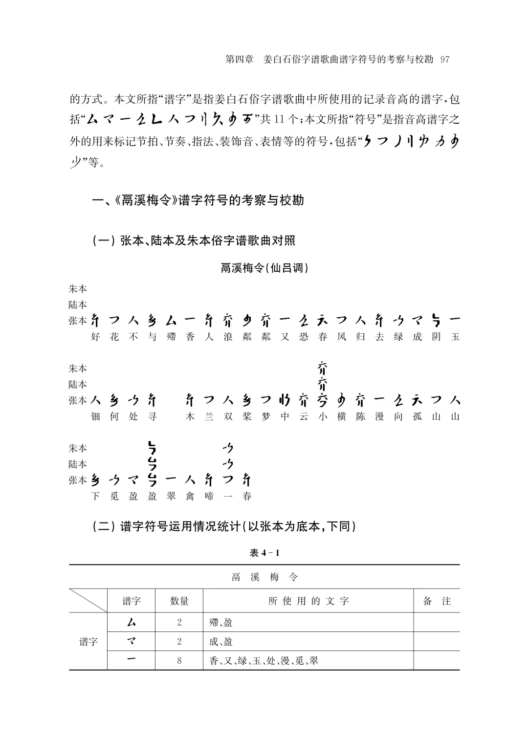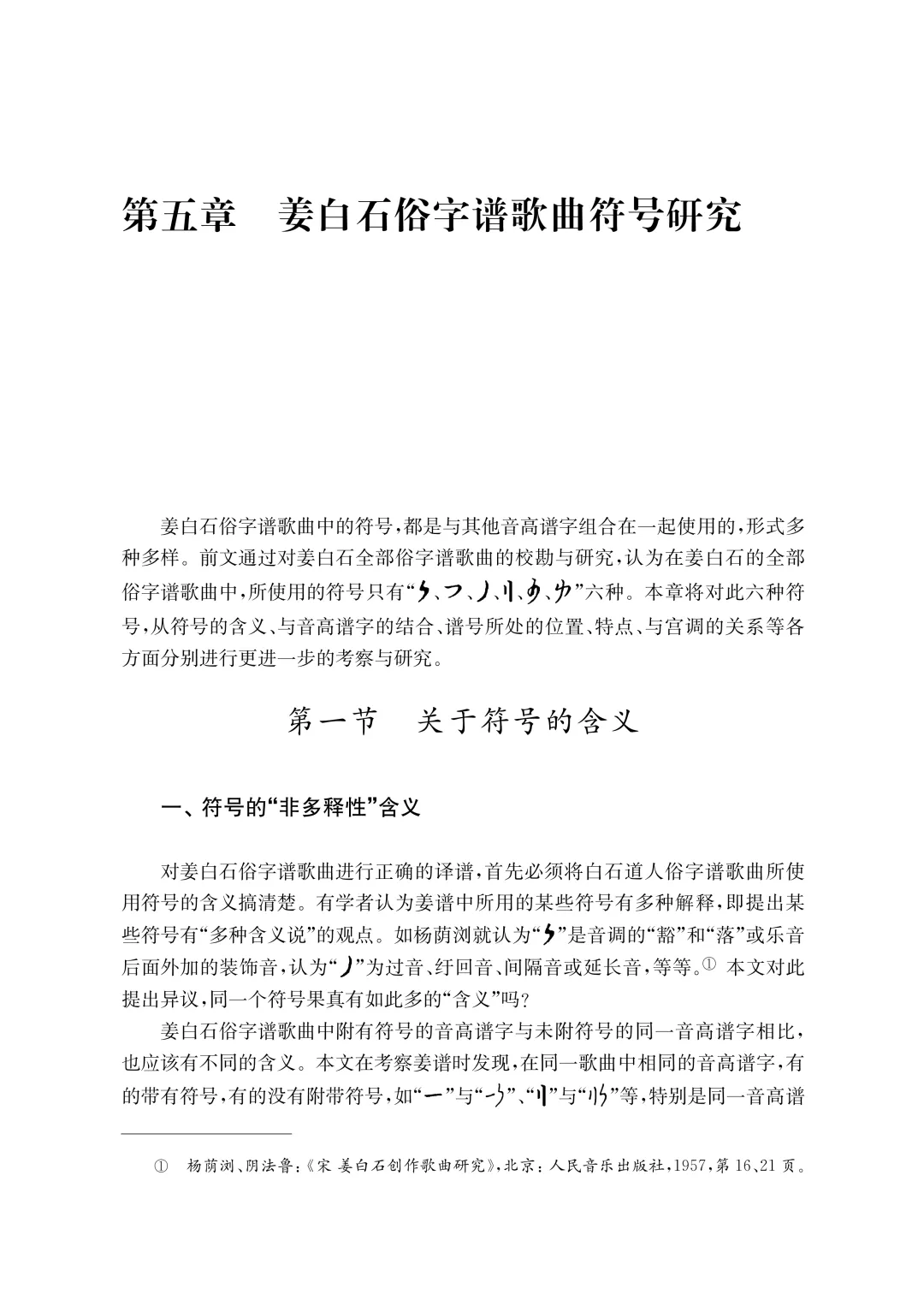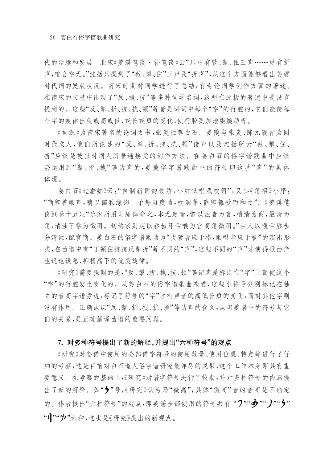 《姜白石俗字谱歌曲研究》是上海音乐学院“宋代音乐文化阐释与研究文丛”系列丛书之一。本书包括七章及引言、参考文献、后记,内容涉及姜白石俗字谱歌曲的历史考察,歌曲注释,姜白石俗字谱歌曲的研究现状,谱字符号的考察、校勘,以及符号、宫调、译谱诸方面的研究。每一章重点研究白石道人俗字谱歌曲的一个或几个方面,步步深入,从俗字谱歌曲的“外围”到曲谱本身进行全面的研究,提出了不少新的观点,并最终提出了对姜白石十七首俗字谱歌曲的新的译谱。该著作对于俗字谱的校勘、注释以及对谱字、符号、宫调等诸方面的进一步考察,更新、推进了原有的研究基础,具有重要的意义和价值。[1]