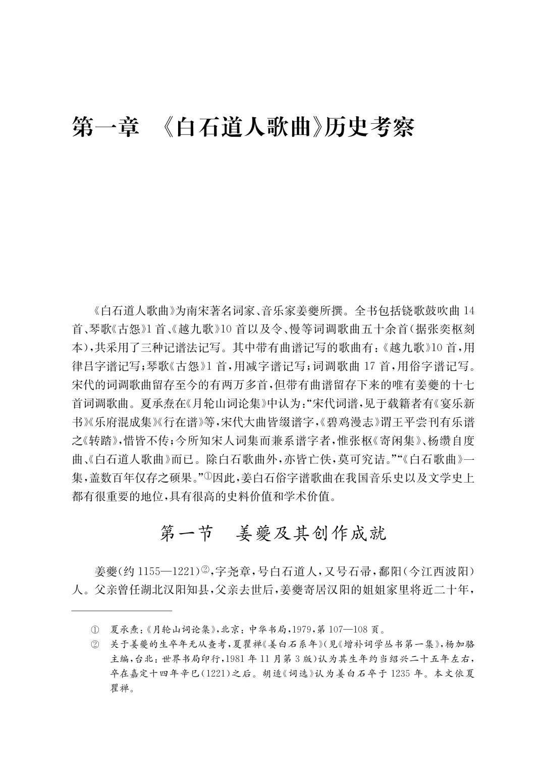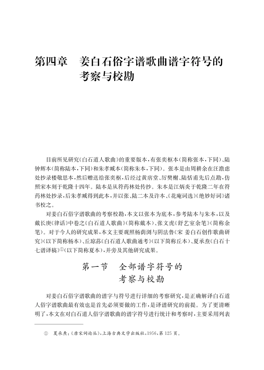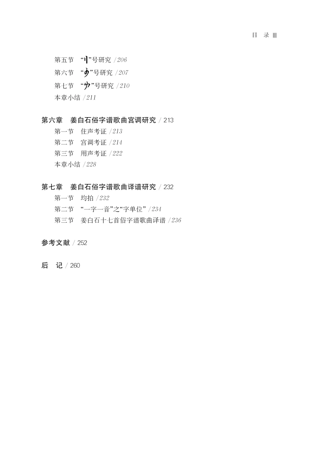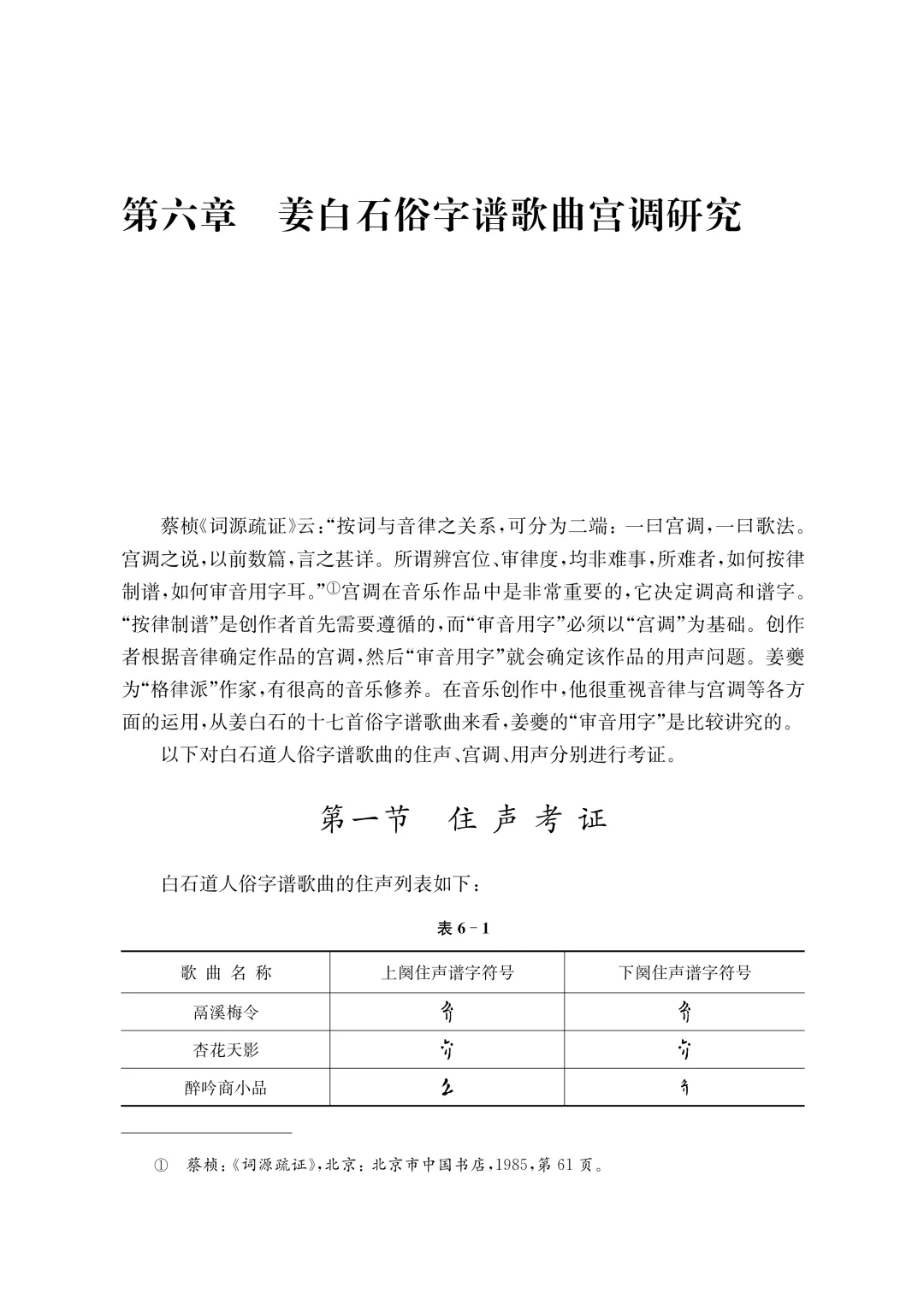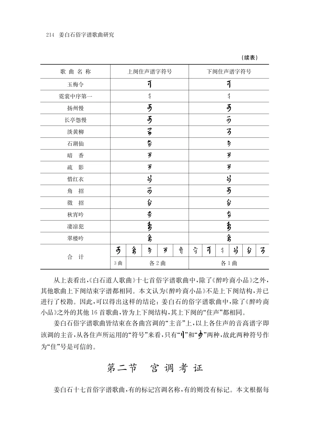 《姜白石俗字谱歌曲研究》是上海音乐学院“宋代音乐文化阐释与研究文丛”系列丛书之一。本书包括七章及引言、参考文献、后记,内容涉及姜白石俗字谱歌曲的历史考察,歌曲注释,姜白石俗字谱歌曲的研究现状,谱字符号的考察、校勘,以及符号、宫调、译谱诸方面的研究。每一章重点研究白石道人俗字谱歌曲的一个或几个方面,步步深入,从俗字谱歌曲的“外围”到曲谱本身进行全面的研究,提出了不少新的观点,并最终提出了对姜白石十七首俗字谱歌曲的新的译谱。该著作对于俗字谱的校勘、注释以及对谱字、符号、宫调等诸方面的进一步考察,更新、推进了原有的研究基础,具有重要的意义和价值。[1]
