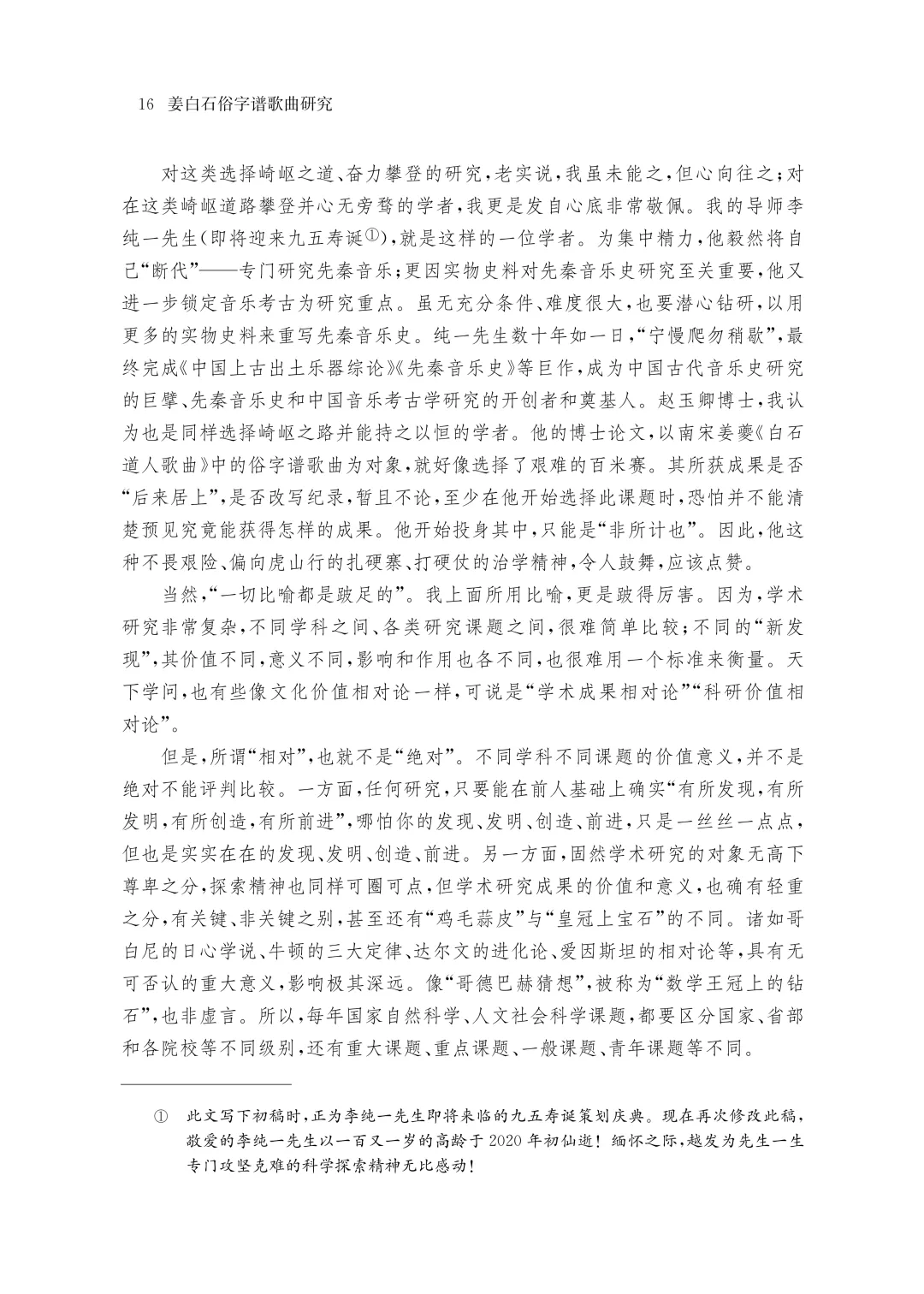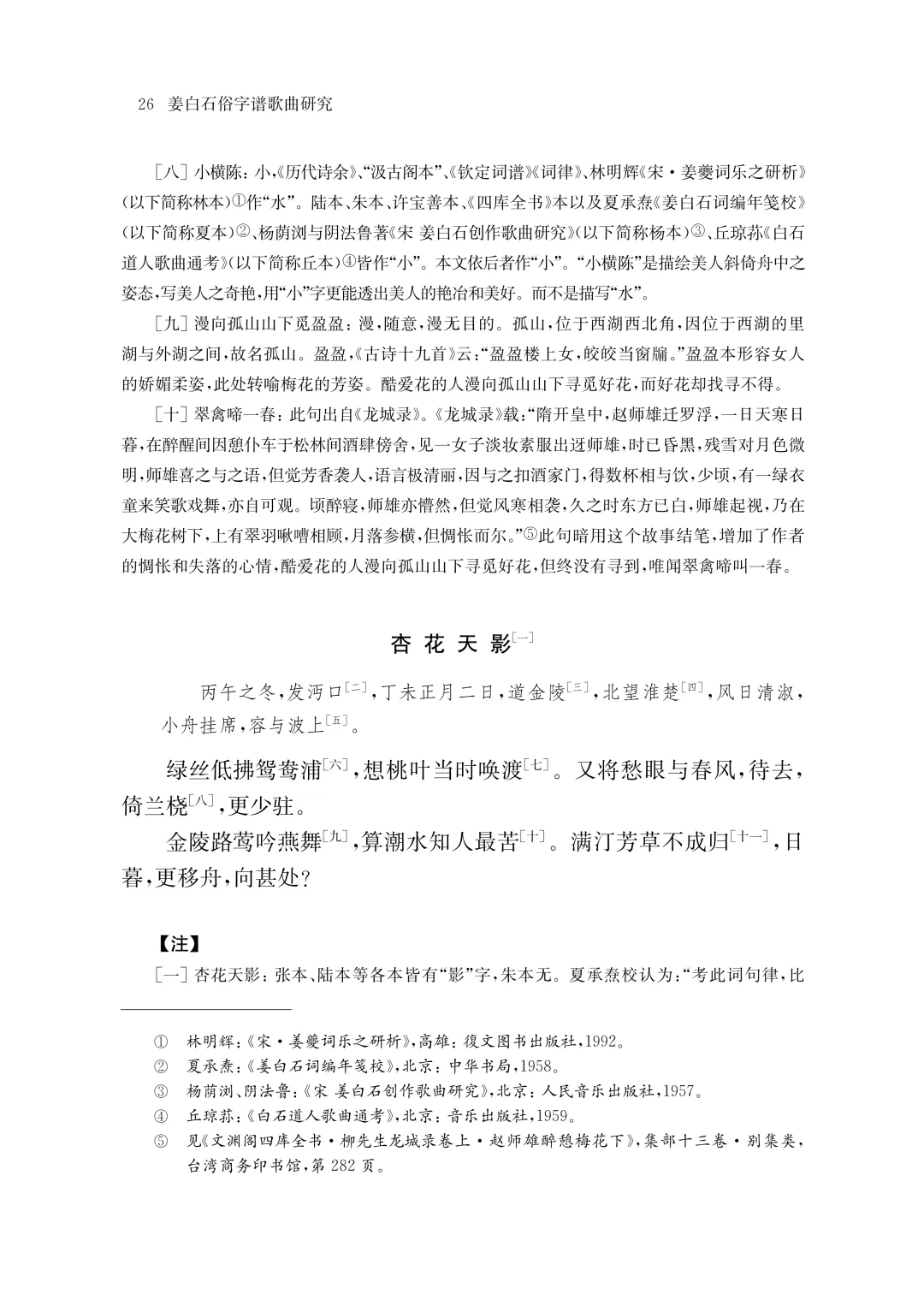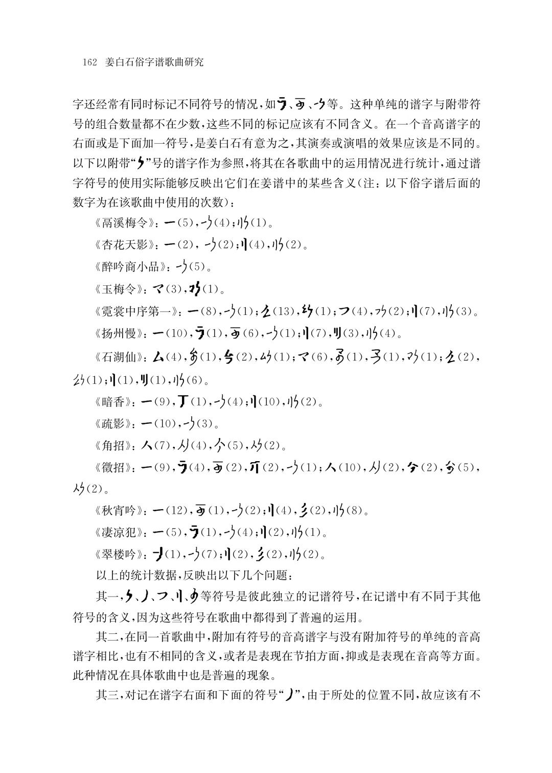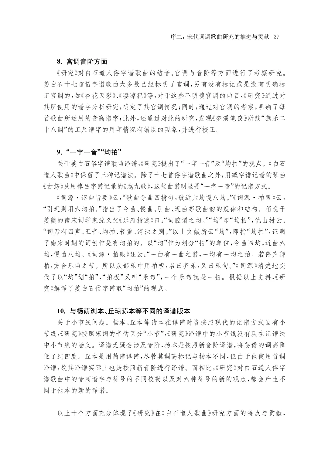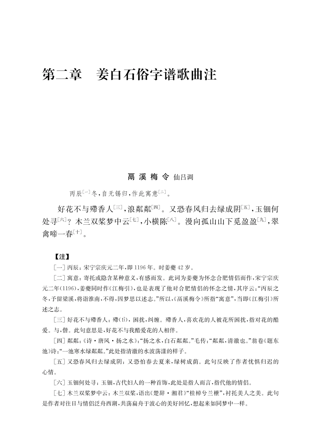 《姜白石俗字谱歌曲研究》是上海音乐学院“宋代音乐文化阐释与研究文丛”系列丛书之一。本书包括七章及引言、参考文献、后记,内容涉及姜白石俗字谱歌曲的历史考察,歌曲注释,姜白石俗字谱歌曲的研究现状,谱字符号的考察、校勘,以及符号、宫调、译谱诸方面的研究。每一章重点研究白石道人俗字谱歌曲的一个或几个方面,步步深入,从俗字谱歌曲的“外围”到曲谱本身进行全面的研究,提出了不少新的观点,并最终提出了对姜白石十七首俗字谱歌曲的新的译谱。该著作对于俗字谱的校勘、注释以及对谱字、符号、宫调等诸方面的进一步考察,更新、推进了原有的研究基础,具有重要的意义和价值。[1]