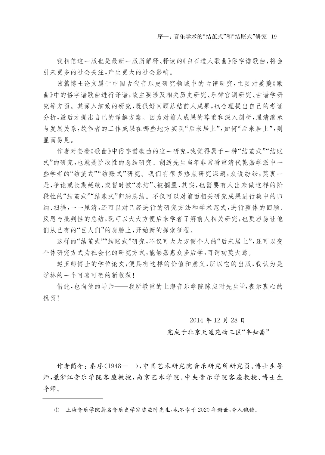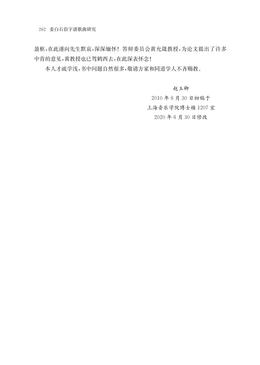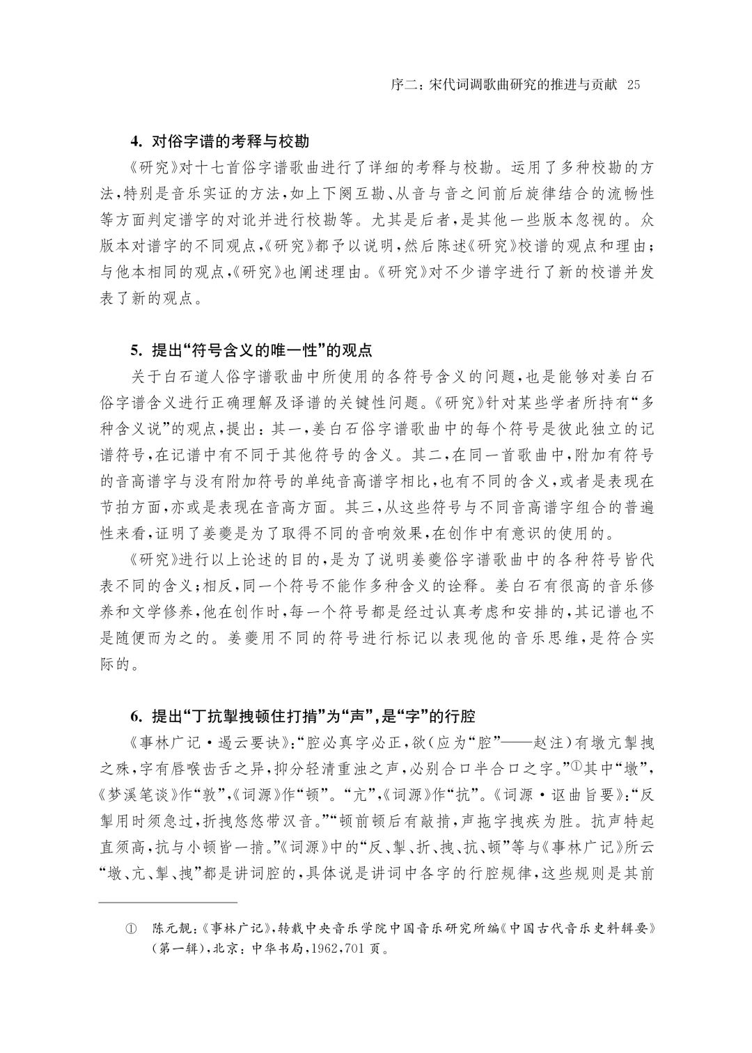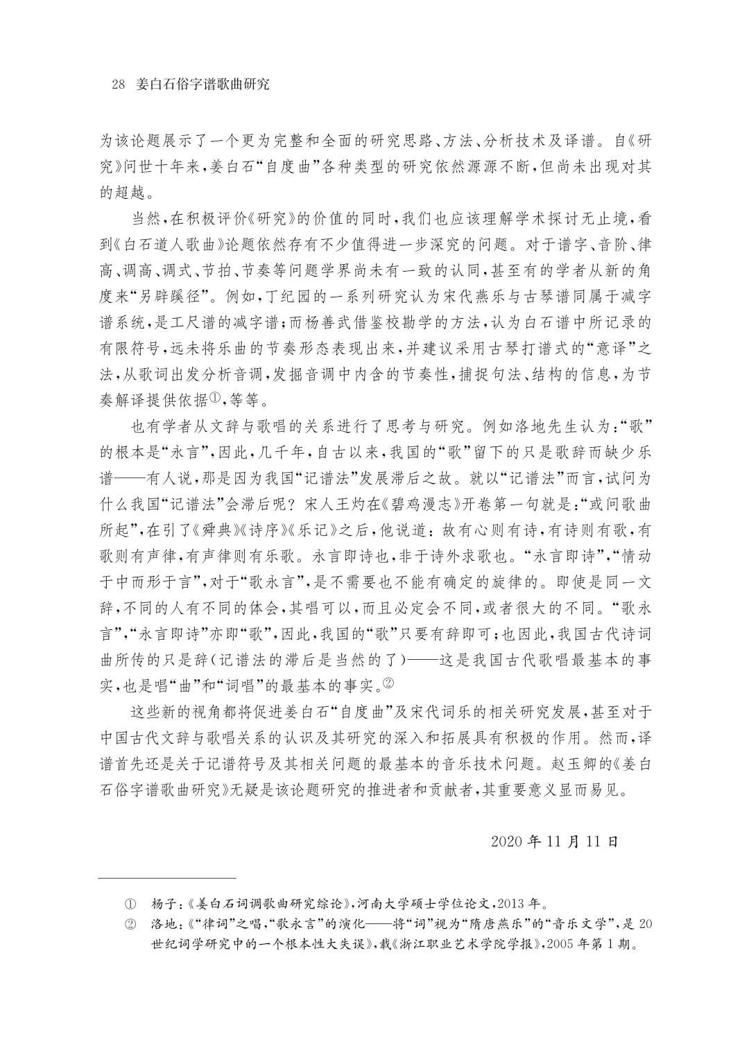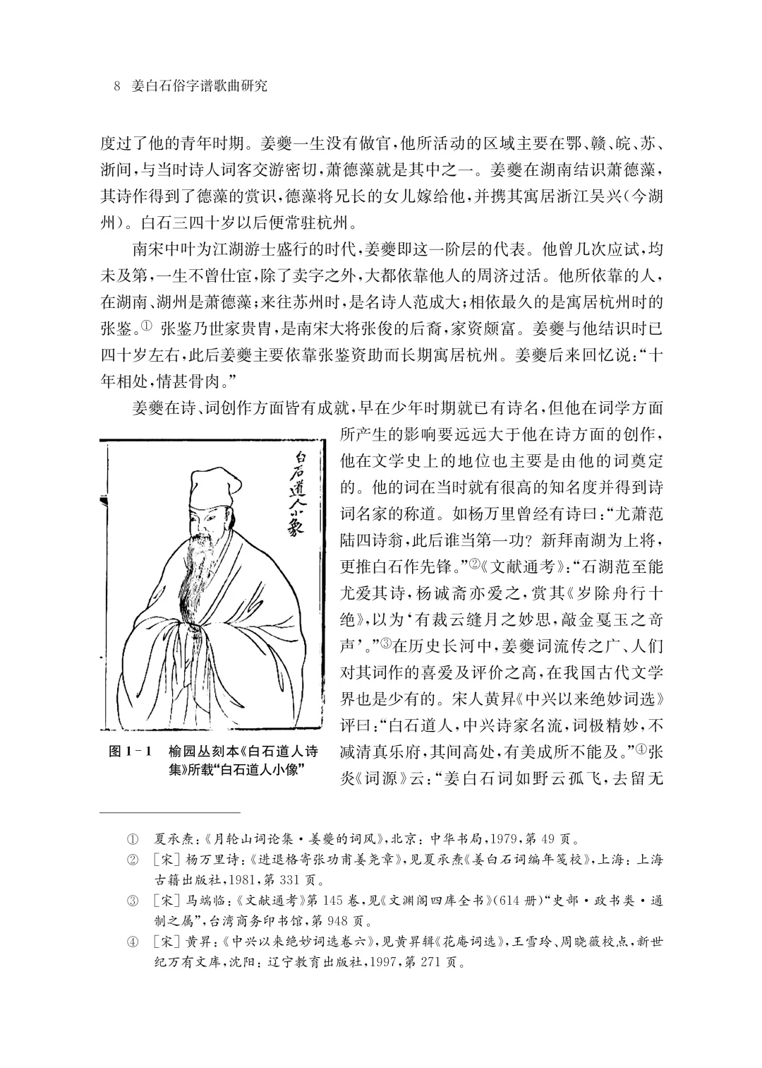 《姜白石俗字谱歌曲研究》是上海音乐学院“宋代音乐文化阐释与研究文丛”系列丛书之一。本书包括七章及引言、参考文献、后记,内容涉及姜白石俗字谱歌曲的历史考察,歌曲注释,姜白石俗字谱歌曲的研究现状,谱字符号的考察、校勘,以及符号、宫调、译谱诸方面的研究。每一章重点研究白石道人俗字谱歌曲的一个或几个方面,步步深入,从俗字谱歌曲的“外围”到曲谱本身进行全面的研究,提出了不少新的观点,并最终提出了对姜白石十七首俗字谱歌曲的新的译谱。该著作对于俗字谱的校勘、注释以及对谱字、符号、宫调等诸方面的进一步考察,更新、推进了原有的研究基础,具有重要的意义和价值。[1]