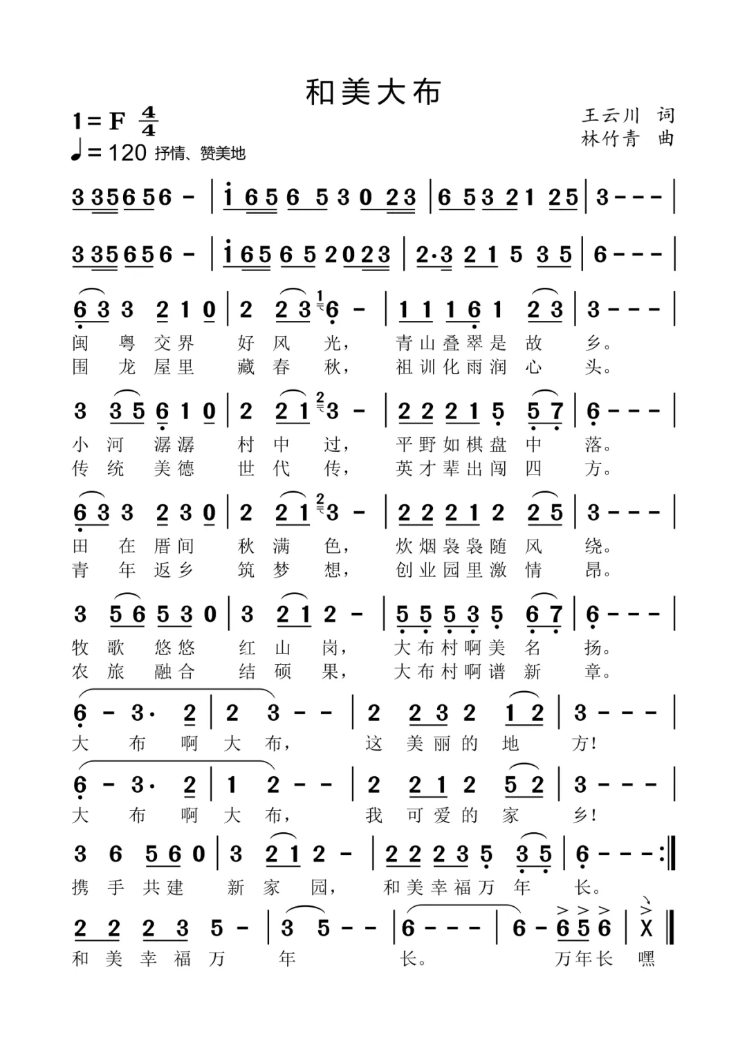 《和美大布》是一首深情礼赞福建省武平县大布村(地处闽粤交界)的村歌。歌曲以如诗如画的笔触,描绘家乡的秀美风光,勾勒出大布村最具特色的和美画卷。它不仅展现了大布村深厚的客家人文底蕴,更热情讴歌了其与时俱进的时代风貌;副歌以深情的旋律反复咏叹“大布啊大布”,直抒胸臆,表达了对这片美丽故土的无限热爱与自豪。整首歌巧妙融合自然之美、人文之韵与发展之新,最终升华至村民携手共建“和美幸福万年长”的共同愿景。