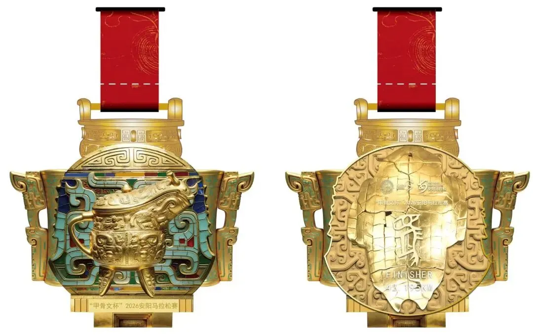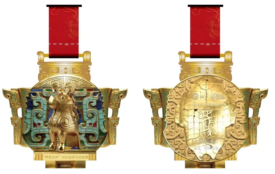 背面采用甲骨文龟甲造型,篆刻甲骨文 “马”字——既呼应2026马年,又紧扣马拉松主题。