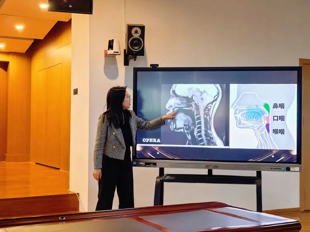 公开课伊始,池雨璇老师强调:科学的腔体训练是丰富歌唱音色、提升作品表现力的核心路径。她打破仅凭借听觉感受和想象的感性学习方式,将腔体训练拆解为「喉咽腔-口咽腔-鼻咽腔」三步递进体系,融合医学、声学、物理学等多学科知识,借助核磁共振影像,直观地向学生们展示了喉咽腔、口咽腔、鼻咽腔在发声时的具体位置与形态,使学生们更深刻地理解腔体打开与声音质感的内在联系,为后续实操中精准调控肌肉与器官奠定了扎实基础。