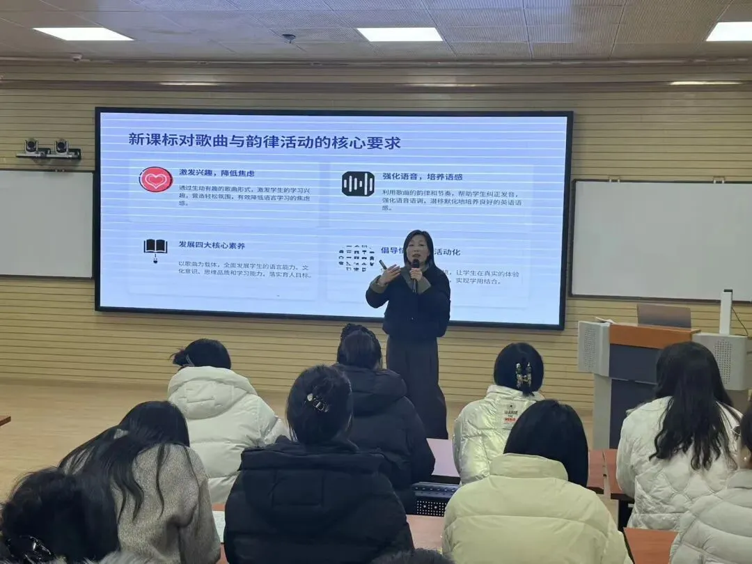 示范课后,王主任围绕新课标下的英语歌曲教学进行了系统、全面的专题解读,内容务实、层层深入: