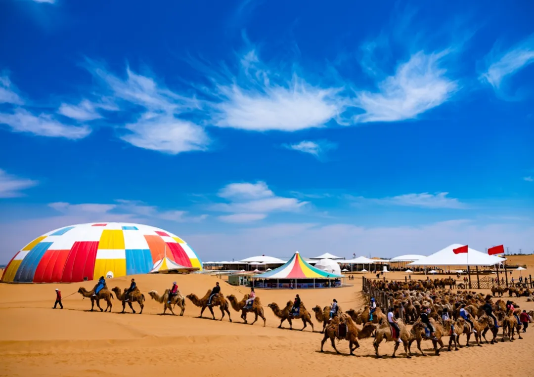 ▶ 下午前往【响沙湾沙漠景区】,这座位于鄂尔多斯市达拉特旗境内库布其沙漠最东端的国家5A级景区,蒙语名称“布热芒哈”意为“带喇叭的沙丘”,因“沙子会唱歌”而得名,也被称为“中国响沙之王”。沙漠内沙丘连绵、沙海无垠,既有沙漠的壮阔雄浑,又有沙湖、沙地绿洲等独特景观,还融入了蒙古族风情,尽显大漠的神秘与壮美。