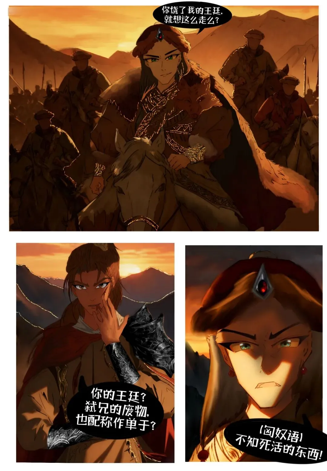 乌鞘岭下那匈奴村落竟是与漠南王廷形成了强烈反差,漠南的风水刁蛮,风沙袭人——如此,那些匈奴人似乎都活在无止尽的死寂与防备之中,即便一时间歌台暖响,内里却是冷袖凄凉,便似伊稚斜杀死军臣单于那一夜,他对他的兄长倾诉小时一同策马猎兽,恣酒惬意童话般的场景,那涂了鎏金漆彩的斟酒壶,里面一半盛着烈酒,另却是比砒霜起效更迅猛的,毒酒。像极伊稚斜对他兄长军臣单于的感情,爱恨参杂,最终却是恨意占了上风——他的兄长便如此亡于一场醉生梦死的谎言之下。