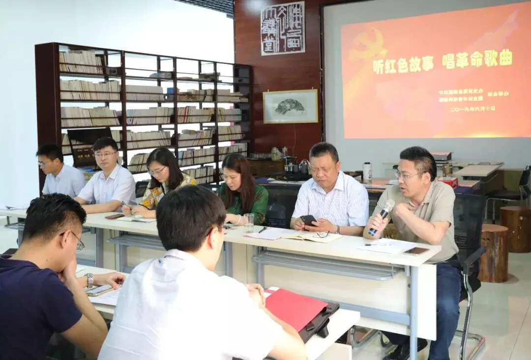 6月10日上午,由县党史办与青创园党总支结对共建活动在青创园海西文化会客厅成功举行。本次活动以“听红色故事 唱革命歌曲”为主题,旨在为县党史办与青创园提供一个内容开放、氛围轻松而活跃的结对共建交流平台,促进广大创业者和青年朋友面对面、“零距离”接受红色教育。县党史办主任徐茂干、副主任尹凤贵、办公室主任臧竞争,青创园董事长费云健、党总支书记许玲佩、工会主席费培兵、创业导师马万志,青创园员工及入园企业代表40余人参加活动。