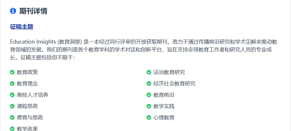 Education Insights (教育洞察) 是一本经过同行评审的开放获取期刊,致力于通过传播前沿研究和学术见解来推动教育领域的发展。我们的期刊是各个教育学科的学术对话和创新平台,旨在支持全球教育工作者和研究人员的专业成长。