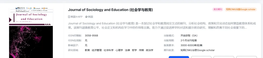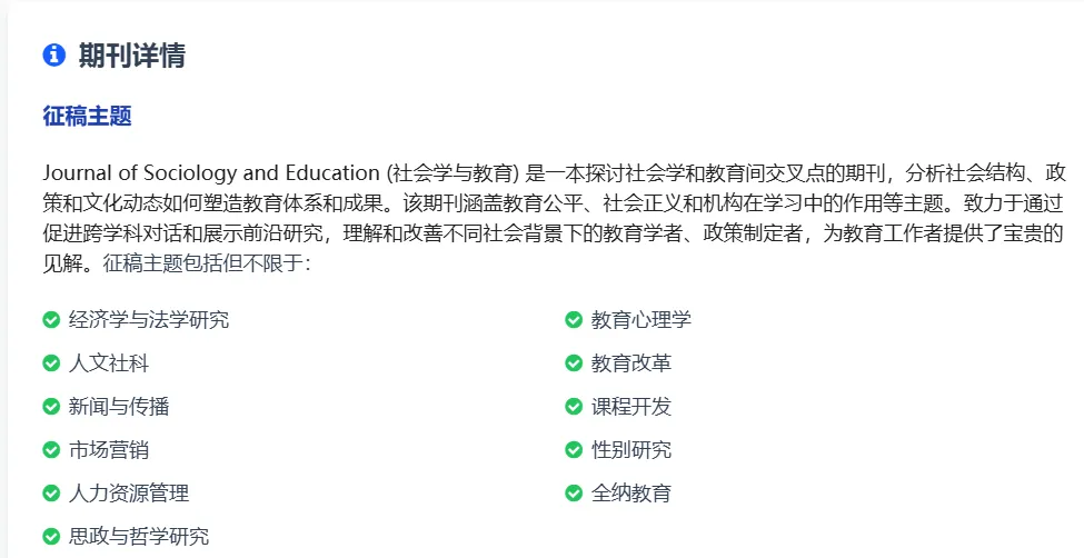 Journal of Sociology and Education (社会学与教育) 是一本探讨社会学和教育间交叉点的期刊,分析社会结构、政策和文化动态如何塑造教育体系和成果。该期刊涵盖教育公平、社会正义和机构在学习中的作用等主题。致力于通过促进跨学科对话和展示前沿研究,理解和改善不同社会背景下的教育学者、政策制定者,为教育工作者提供了宝贵的见解。