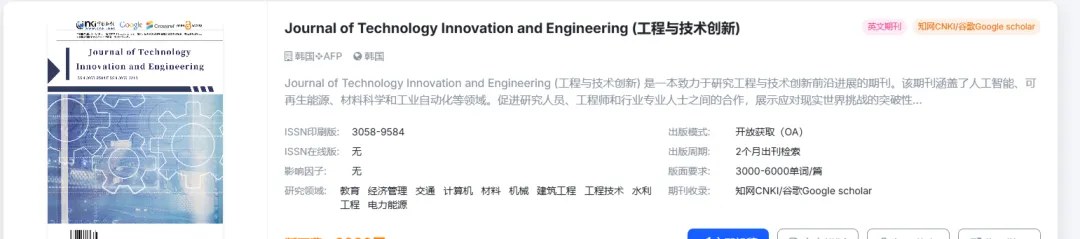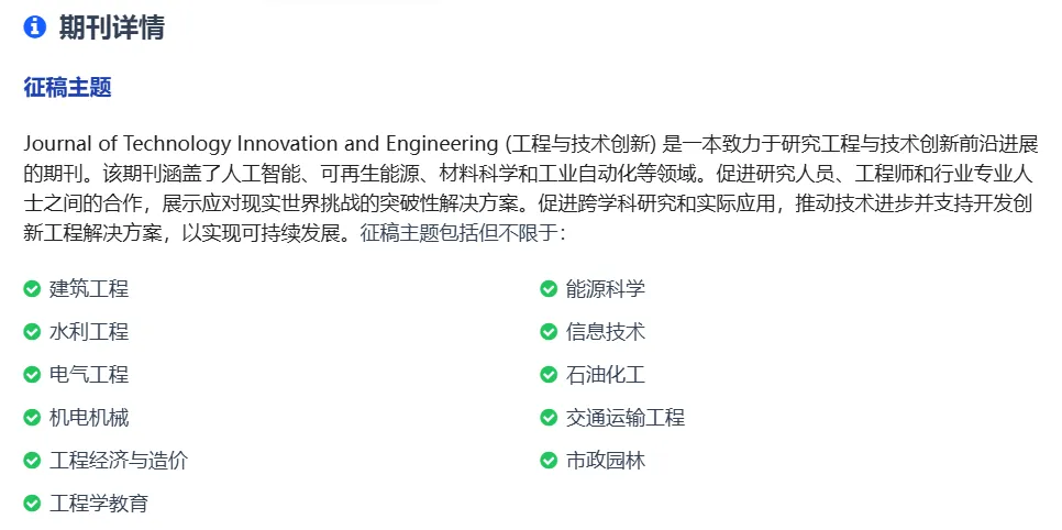 Journal of Technology Innovation and Engineering (工程与技术创新) 是一本致力于研究工程与技术创新前沿进展的期刊。该期刊涵盖了人工智能、可再生能源、材料科学和工业自动化等领域。促进研究人员、工程师和行业专业人士之间的合作,展示应对现实世界挑战的突破性解决方案。促进跨学科研究和实际应用,推动技术进步并支持开发创新工程解决方案,以实现可持续发展。