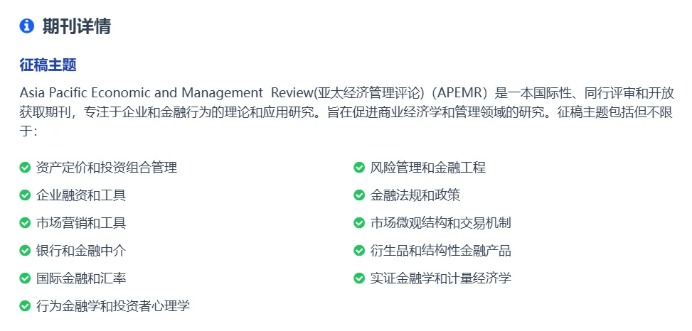 Asia Pacific Economic and Management Review(亚太经济管理评论)(APEMR)是一本国际性、同行评审和开放获取期刊,专注于企业和金融行为的理论和应用研究。旨在促进商业经济学和管理领域的研究。