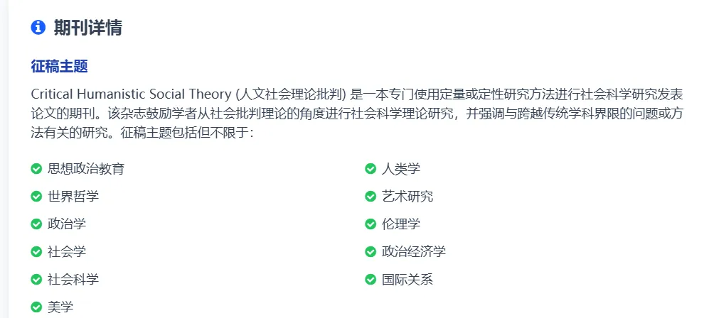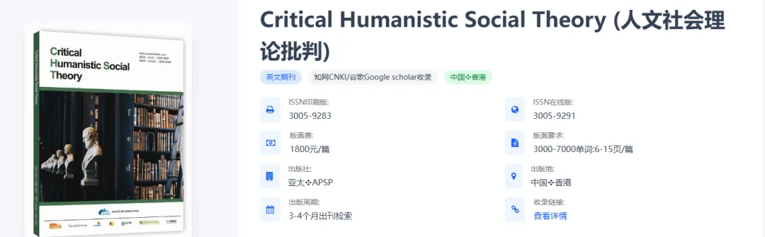 Critical Humanistic Social Theory (人文社会理论批判) 是一本专门使用定量或定性研究方法进行社会科学研究发表论文的期刊。该杂志鼓励学者从社会批判理论的角度进行社会科学理论研究,并强调与跨越传统学科界限的问题或方法有关的研究。