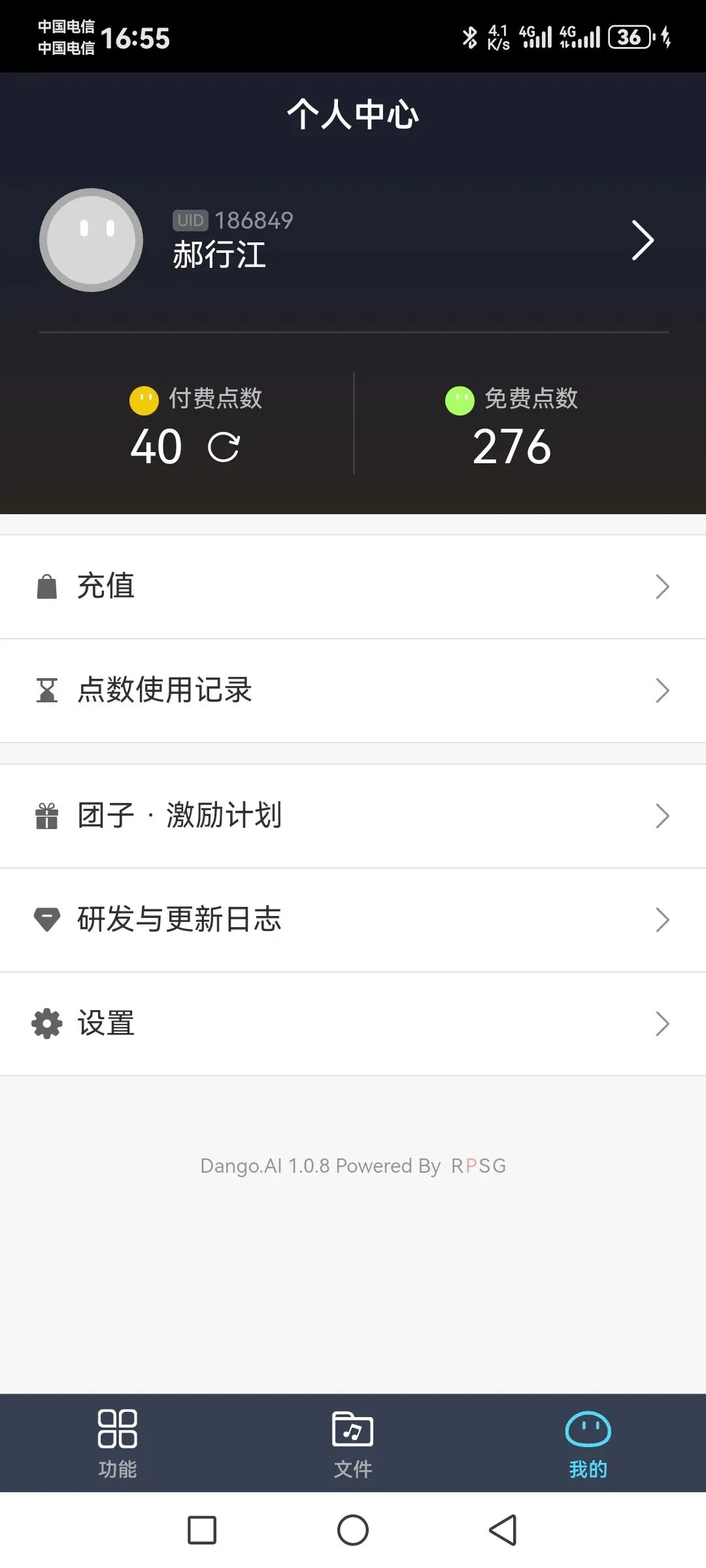 很多家人肯定关心收费问题,你们看,它是用点数计费的,我这里免费点数就有276,付费点数也有40,咱们普通用户日常剪视频、唱歌找伴奏,偶尔处理一下音频,免费的额度完全够用,根本不用花钱,除非你一天到晚批量处理文件,不然真的够用到爽。还有大家别担心处理完的文件找不到,底部导航栏中间有个【文件】按钮,你所有处理好、下载好的文件,全在这里存着,随时能导出用,特别方便。