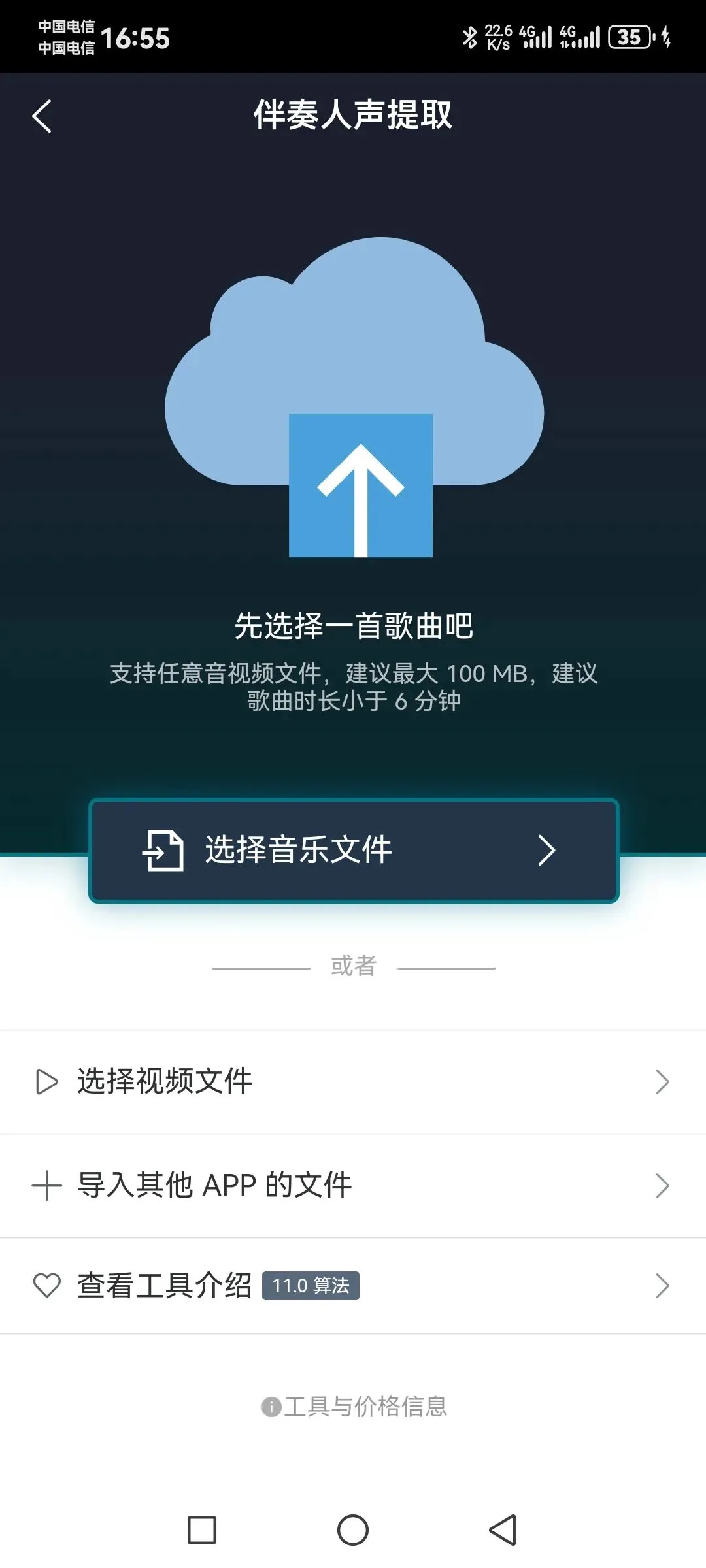 首先打开团子AI,首页就是整理好的功能列表,咱们最常用的,就是第一个【伴奏人声提取】,这个也是它的王牌功能,用的是11.0的算法,分离效果超顶。点进去之后,界面特别简单,完全不用你调任何参数,有三个导入选项:如果你手机里存了现成的音频文件,就点【选择音乐文件】;如果是想提取视频里的音频、做伴奏分离,就选【选择视频文件】;甚至是其他APP里的文件,也能直接点【导入其他APP的文件】导进来,官方建议文件最大100MB,时长小于6分钟,咱们日常唱歌、剪视频用,完全够了。