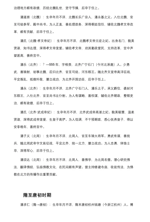 潘氏(北齐·武成帝妃):生卒年月不详,北齐武成帝高湛之妃。貌美聪慧,温柔贤淑,深得武成帝宠爱,生皇子高俨。为人低调,不干预朝政,悉心抚养皇子,得以安享晚年,善终宫中。