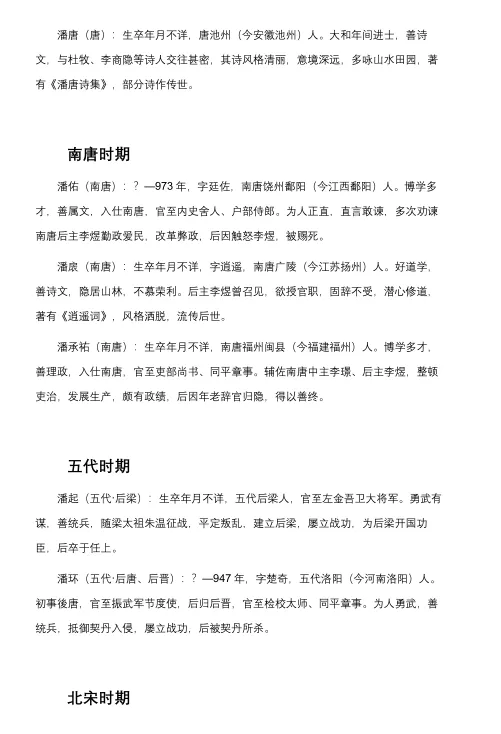 潘承祐(南唐):生卒年月不详,南唐福州闽县(今福建福州)人。博学多才,善理政,入仕南唐,官至吏部尚书、同平章事。辅佐南唐中主李璟、后主李煜,整顿吏治,发展生产,颇有政绩,后因年老辞官归隐,得以善终。