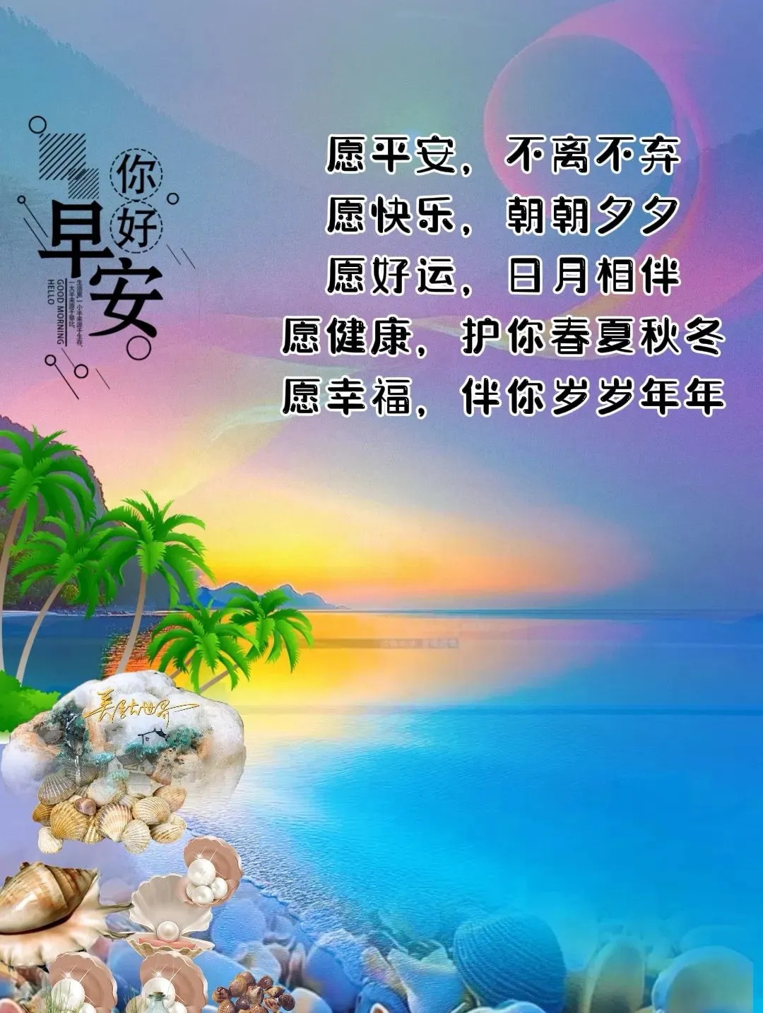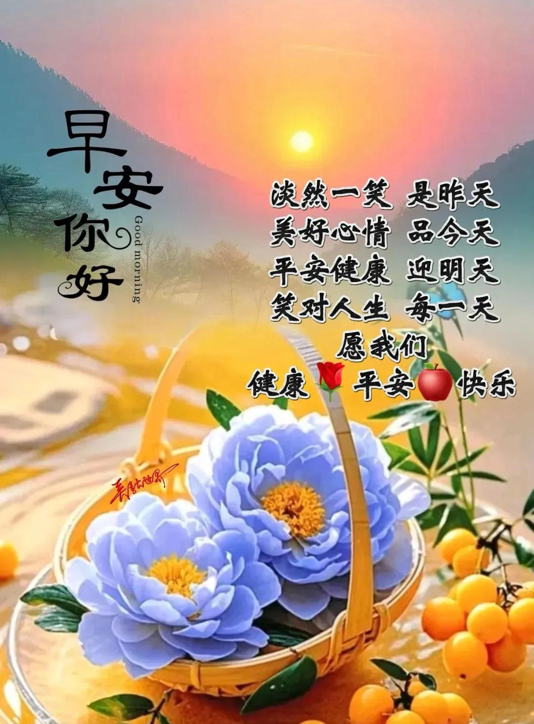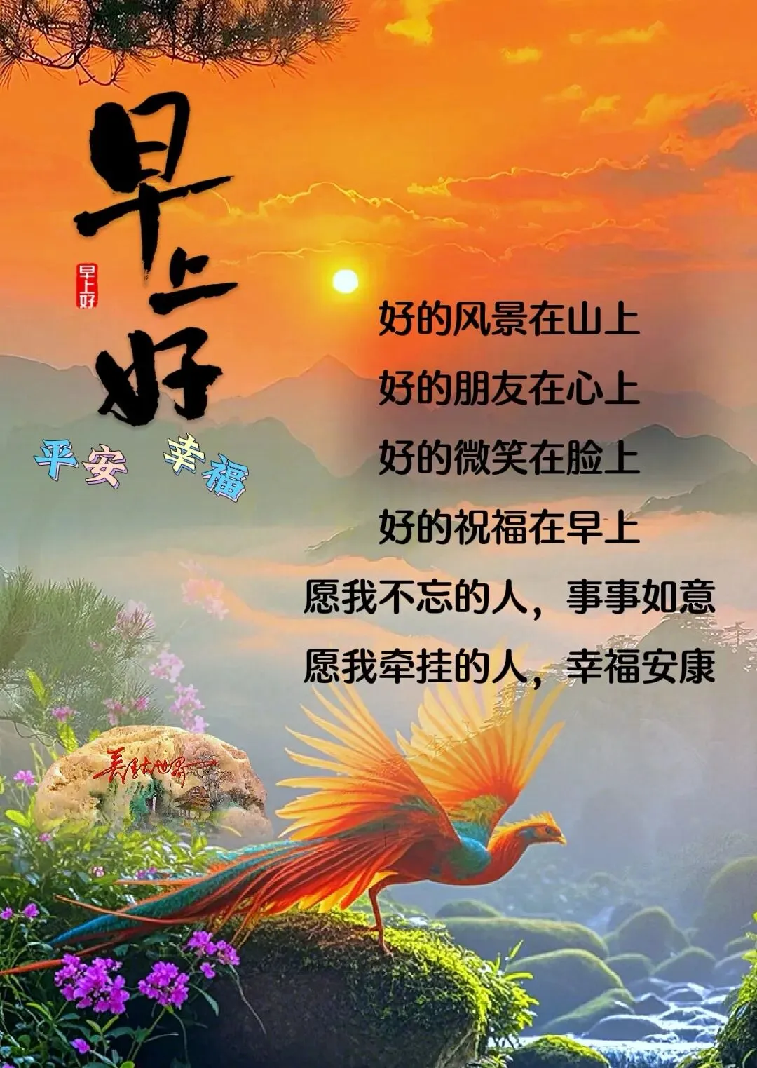 4、山有美景人有缘,不论远近都挂念,清晨问候送祝福,平安健康是心愿。多保重,快乐过好每一天。愿你快乐常伴,好运不断,阳光普照,星光闪耀,心想事成,事事顺心,身体健康,幸福永存!早上好!
