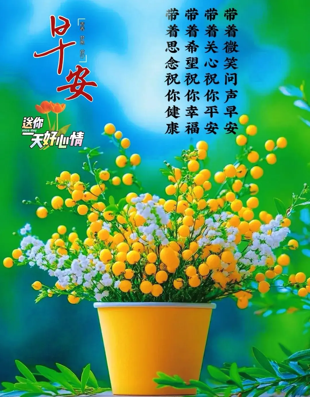 5、🌻早安!清晨问候,传递温馨与美好;祝福声声,愿你天天开心笑。阳光洒满大地,快乐如影随形。好运常伴左右,幸福与你同行。愿你心情舒畅,开启美好新一天。加油!🌈🌈