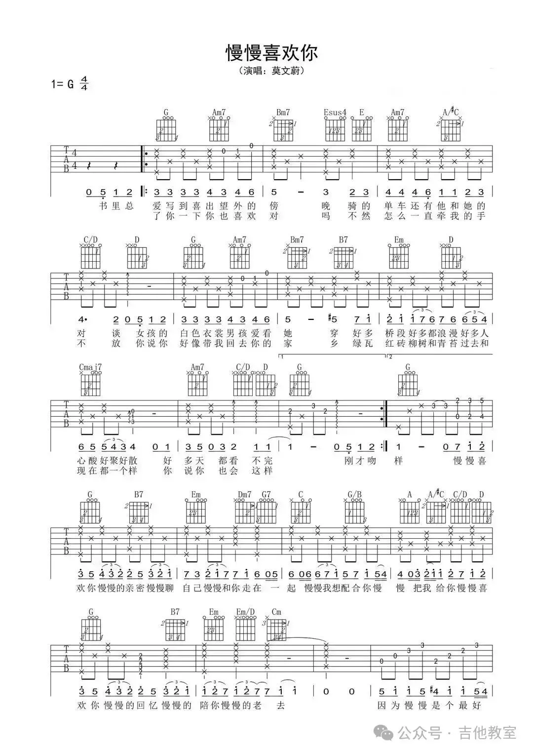 莫文蔚《慢慢喜欢你》是温柔流行曲,节奏缓慢。适合轻松温馨的弹唱场景,氛围甜蜜安静。