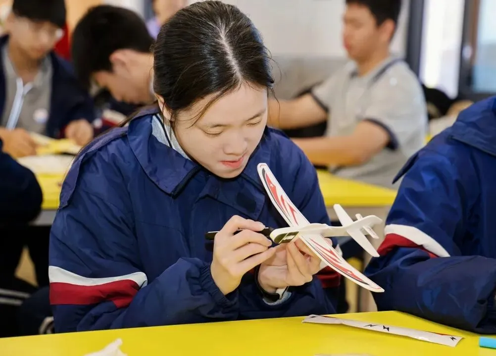 航模国防体验课上,同学们化身小小国防少年,全神贯注拼装军事航模,小心翼翼裁剪零件,为战机、军舰模型认真上色,一笔一划都饱含着对国防力量的向往。