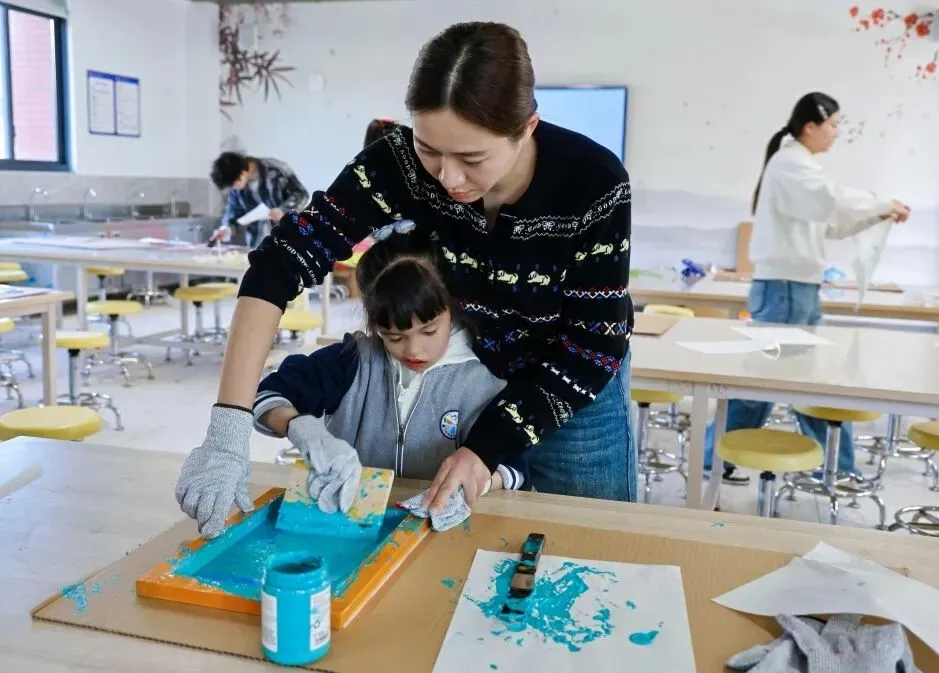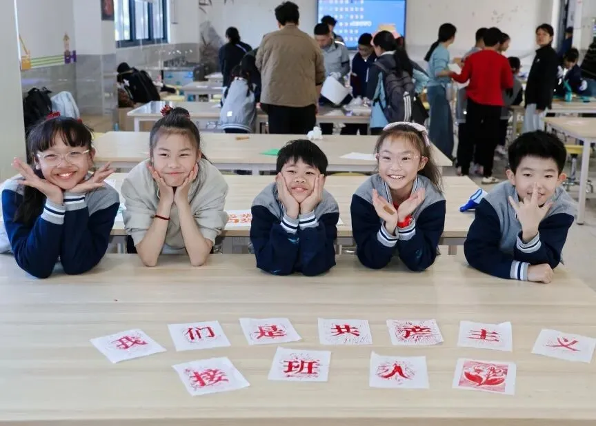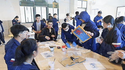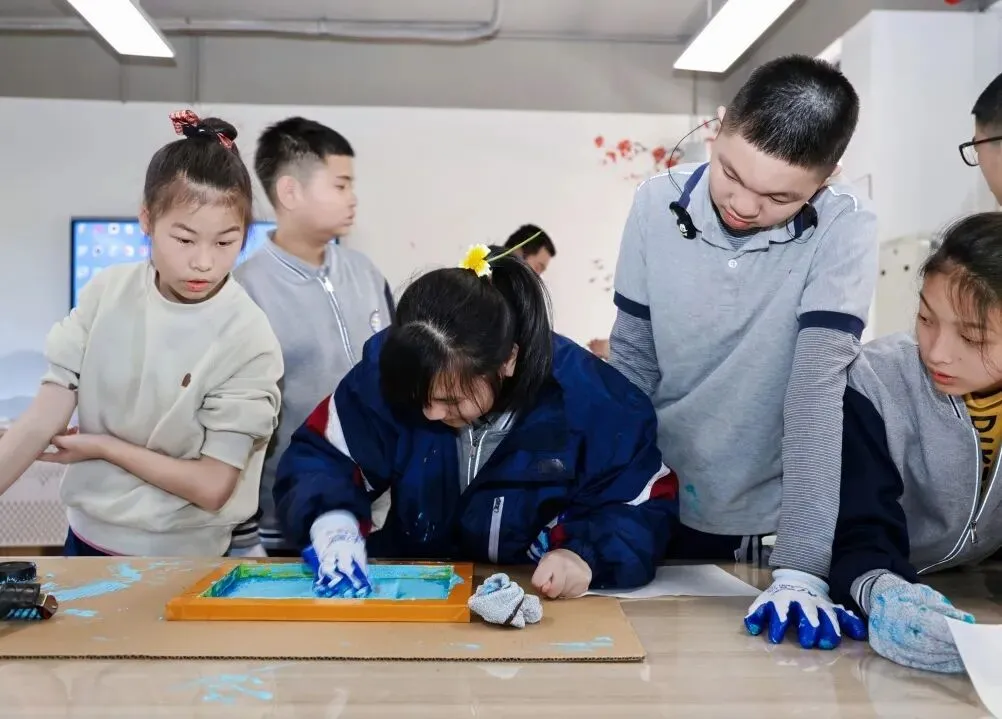 印刷课堂上,同学们以 “英雄小八路” 为主题,手持刷子为拓印版均匀上色,轻柔地将印纸敷上版面,认真拓印、细心揭起,完成后郑重写下自己的名字。在油墨与纸张的交融中,重温革命故事,厚植爱国情怀,让红色基因代代相传。