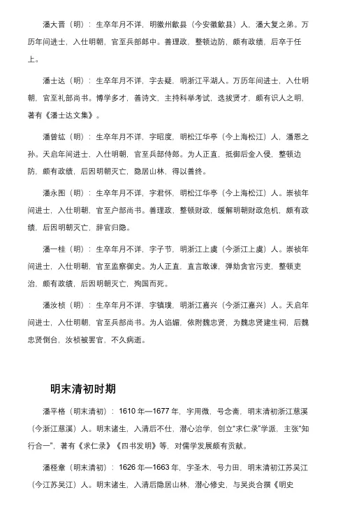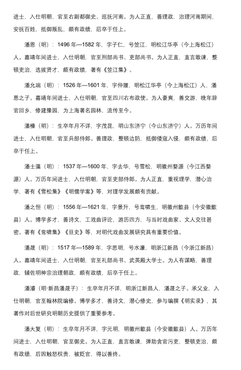 潘濬(明·新昌潘晟子):生卒年月不详,明浙江新昌人,潘晟之子。承父业,入仕明朝,官至翰林院编修。博学多才,善诗文,潜心修史,参与编撰《明实录》,其著作对后世研究明朝历史提供了重要参考。
