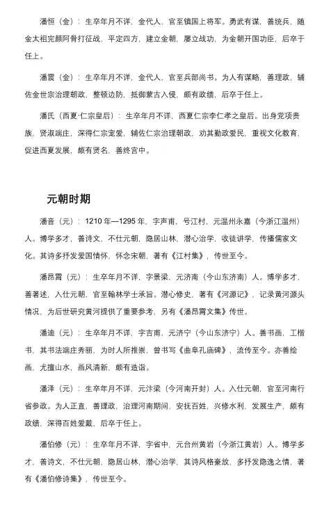潘恒(金):生卒年月不详,金代人,官至镇国上将军。勇武有谋,善统兵,随金太祖完颜阿骨打征战,平定四方,建立金朝,屡立战功,为金朝开国功臣,后卒于任上。