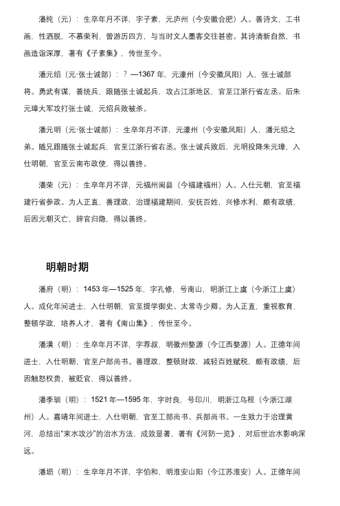 潘元明(元·张士诚部):生卒年月不详,元濠州(今安徽凤阳)人,潘元绍之弟。随兄跟随张士诚起兵,官至江浙行省右丞。张士诚兵败后,元明投降朱元璋,入仕明朝,官至云南布政使,得以善终。