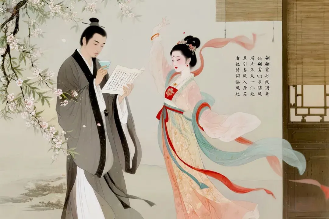 看他诗词临风处,且引春风入屠苏,翩翩霓裳羽衣随风舞。