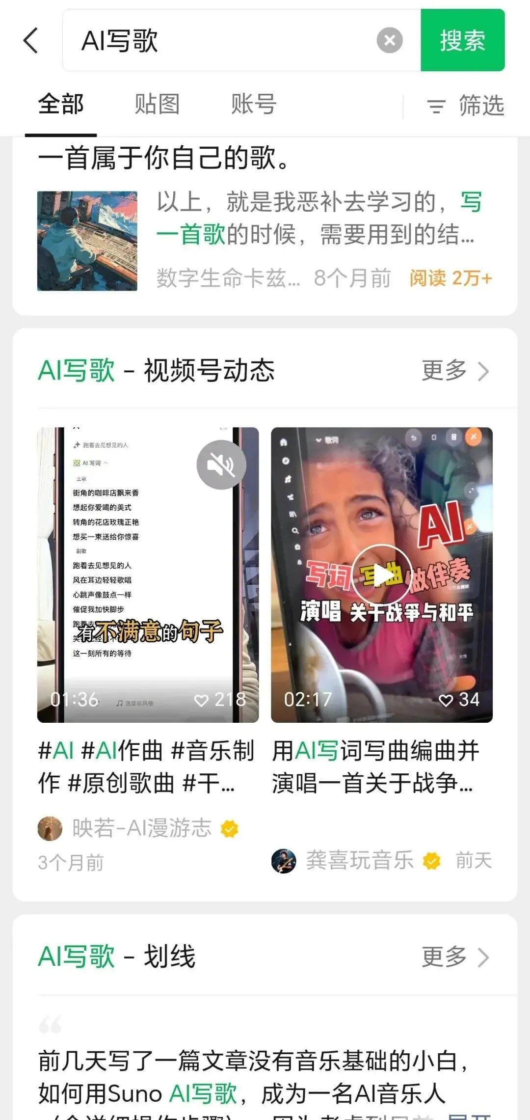 现在AI制作歌曲,有些也可以商用赚钱了,我还没研究过。有人研究得比较深入,感兴趣的可以搜索关键词带“suno”或者“AI写歌”的公众号文章。