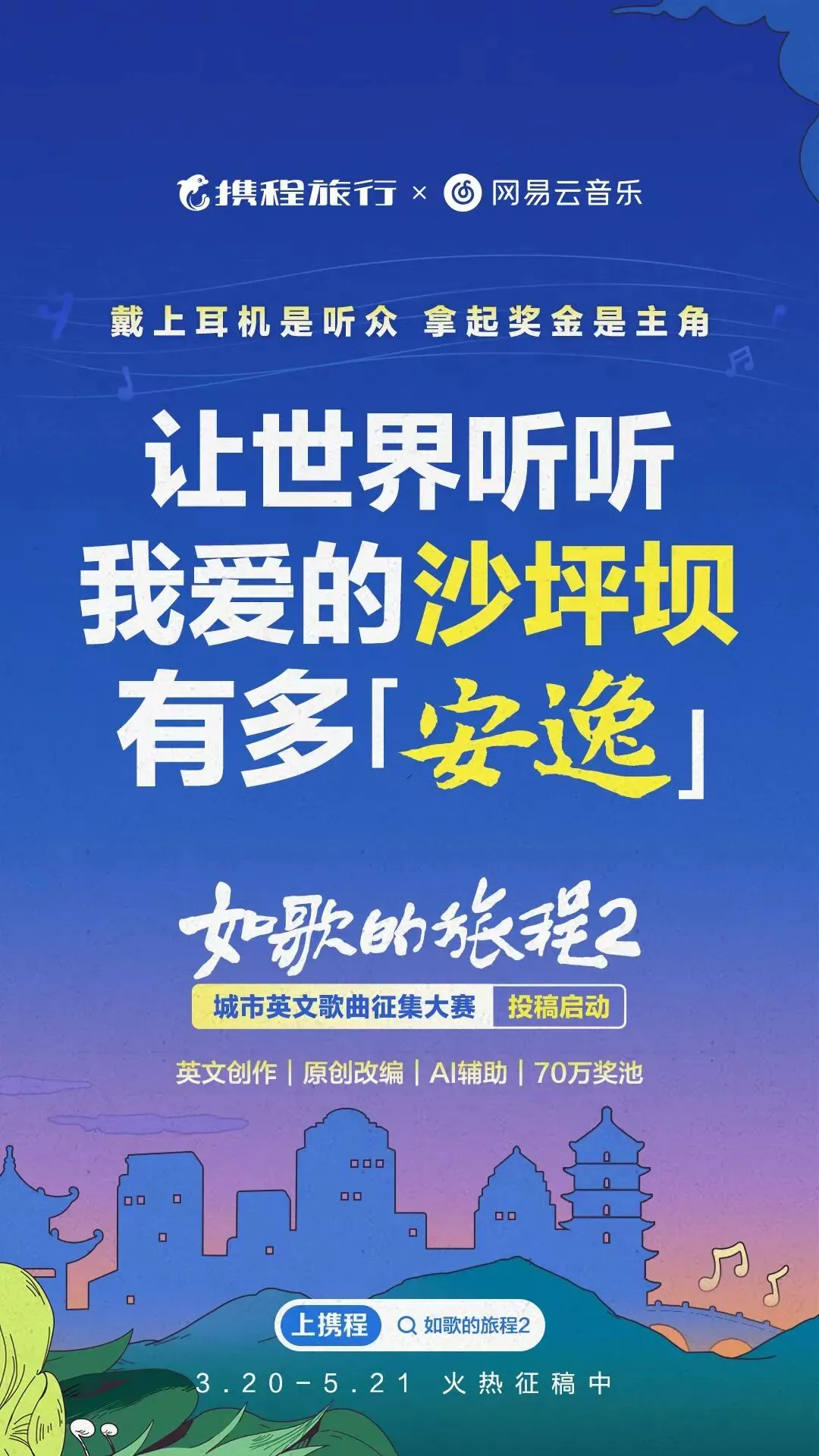 携程始终致力于通过音乐与旅行场景的深度联结,让中国城市文化被更多人看见。此次携手网易云音乐再次举办《如歌的旅程》城市原创音乐征集系列赛事,正是希望通过英文歌曲这一载体,让更多海外朋友通过旋律认识中国、走进中国。重庆市沙坪坝区文旅委热烈响应此次赛事,诚邀广大创作者聚焦沙坪坝,用歌声定格磁器口的千年烟火、歌乐山的苍翠灵秀,诉说红岩精神的薪火相传、古埙雅韵的非遗魅力,描绘三峡广场的都市繁华与嘉陵小渡的流动诗意。我们期待与携程、网易云音乐及所有创作者携手,以旋律为媒,让沙坪坝的山水之美、人文之韵跨越山海,让世界透过歌声,读懂这座城的底蕴与活力,共邀海外友人走进沙坪坝、读懂新重庆。