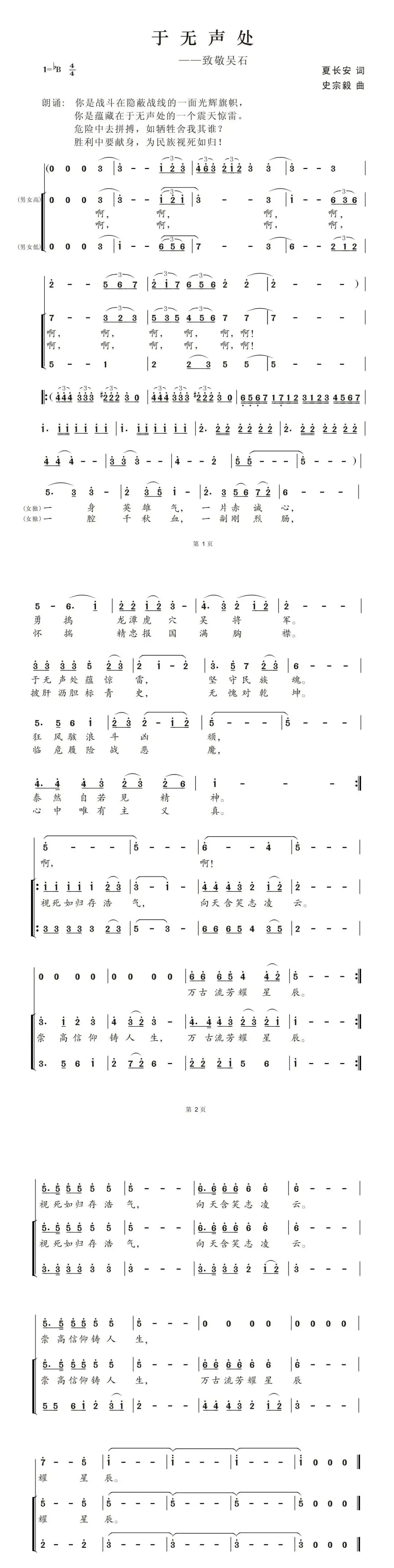 歌词由诗人、词家夏长安先生创作。几经酝酿、反复推敲、数易其稿,《于无声处》的歌词创作终于完成。歌词表达的中心思想明确、立意较高、内容集中、人物形象鲜明、语言精准洗炼。充分表现了吴石将军身处龙潭虎穴、心怀民族大义、意志刚毅坚强、大智大勇、不畏牺牲、心昭日月、情动乾坤、视死如归、万古流芳的精神写照。
