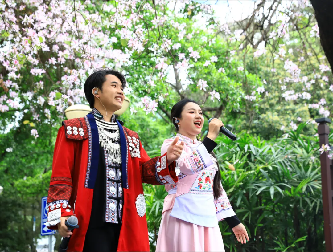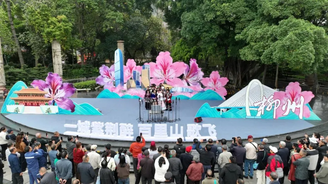 3月21日上午,鱼峰公园在北门这株古紫荆树下举办“歌起鱼峰 ‘荆’彩邀约——寻找紫荆同龄人”主题活动。活动现场,花影婆娑间,本土网红歌手“山三妹”以山歌相和,悠扬曲调随风飘荡,市民游客徜徉其间,一边沉醉于烂漫花海,一边聆听千年山歌余韵,在融融春光中,细细品味柳州独有的非遗文化之魅。