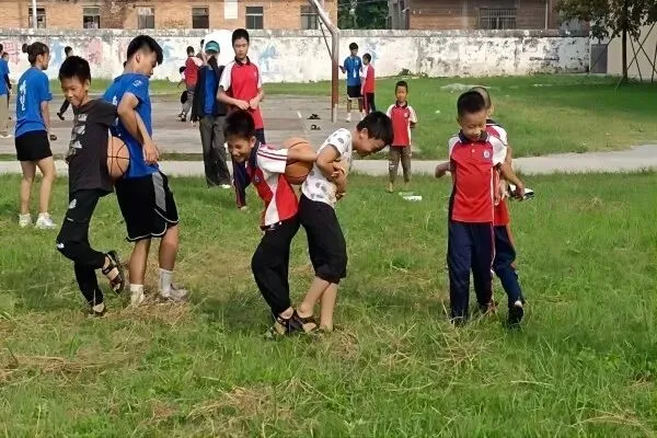 数字两人三足接力赛即两人一组,将双方靠近的小腿用绳子绑起来,从起点跳到前方五十米答题处,回答正确老师提出的加减乘除运算问题后再原路返回到终点。两组进行一场比赛,先到达终点者则胜。