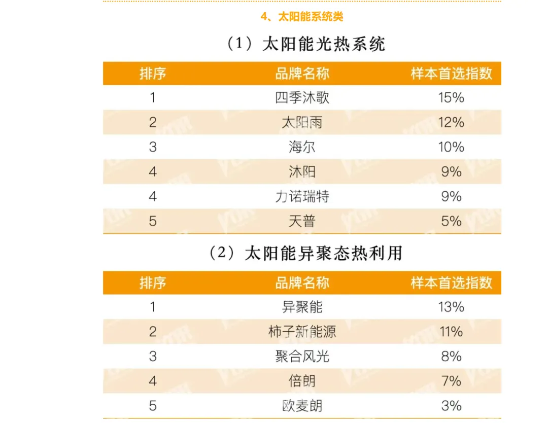 根据研究报告内容显示,首选安装工程类品牌中,太阳能光热系统中,四季沐歌、太阳雨、海尔、沐阳、力诺瑞特、天普等品牌上榜,样本首选指数分别为15%、12%、10%、9%、9%、5%;