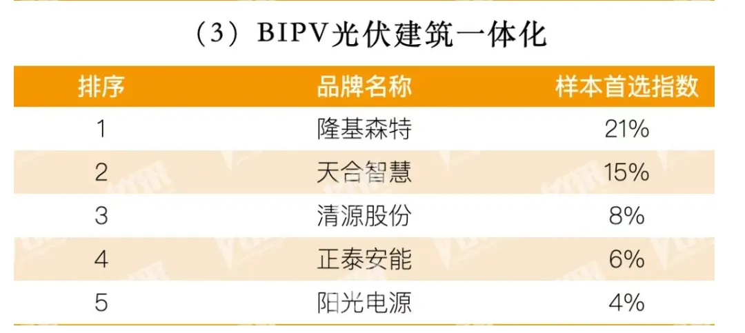 BIPV光伏建筑一体化中,隆基森特、天合智慧、清源股份、正泰安能、阳光电源等品牌上榜,样本首选指数分别为21%、15%、8%、6%、4%;