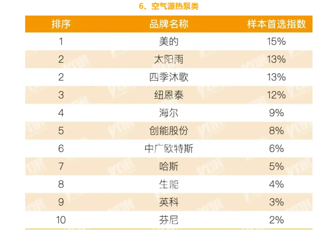 空气源热泵中,美的、太阳雨、四季沐歌、纽恩泰、海尔、创能股份、中广欧特斯、哈斯、生能、英科、芬尼上榜,样本首选指数分别为15%、13%、13%、12%、9%、8%、6%、5%、4%、3%、2%;