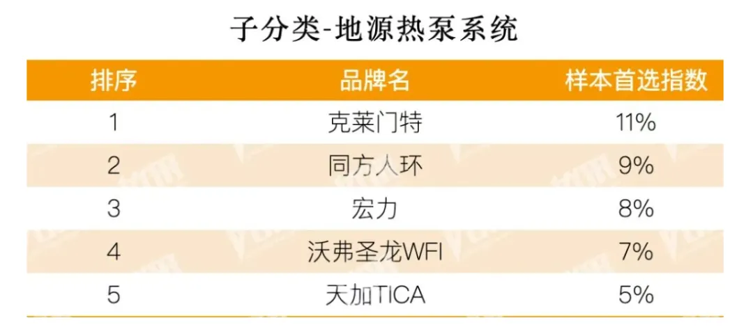 地源热泵系统中,克莱门特、同方人环、宏力、沃弗圣龙WFI、天加TICA等品牌上榜,样本首选指数分别为11%、9%、8%、7%、5%。