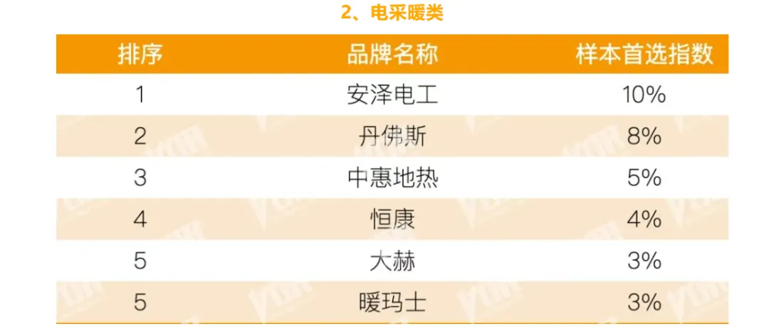 电采暖类中,安泽电工、丹佛斯、中惠地热、恒康、大赫、暖玛士等品牌上榜,样本首先指数分别为10%、8%、5%、4%、3%、3%;