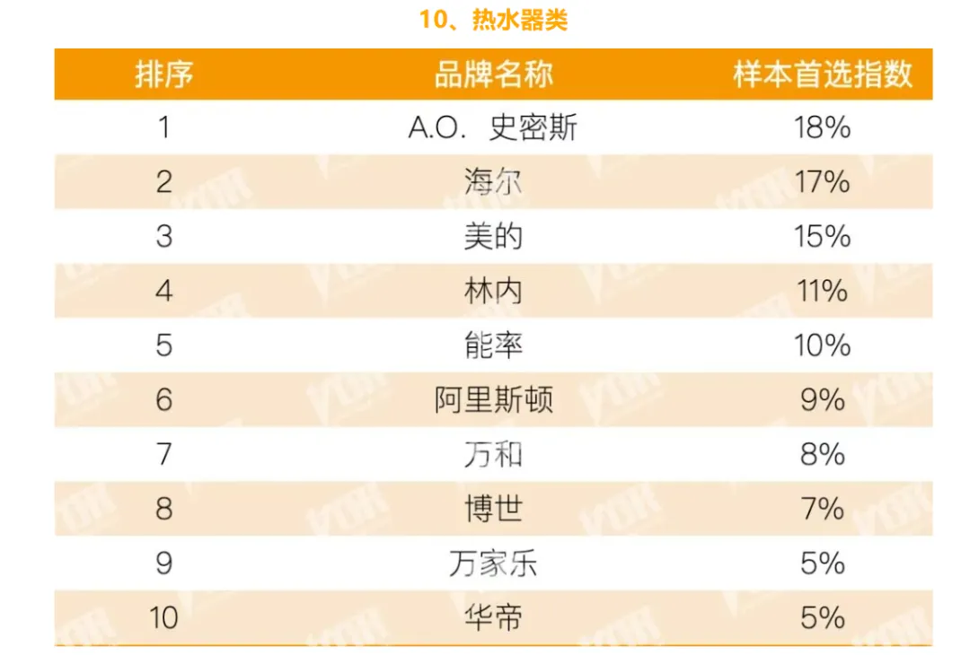 首选装饰材料类品牌中,热水器类,A.O史密斯、海尔、美的、林内、能率、阿里斯顿、万和、博世、万家乐、华帝等品牌上榜,样本首选指数分别为18%、17%、15%、11%、10%、9%、8%、7%、5%、5%。
