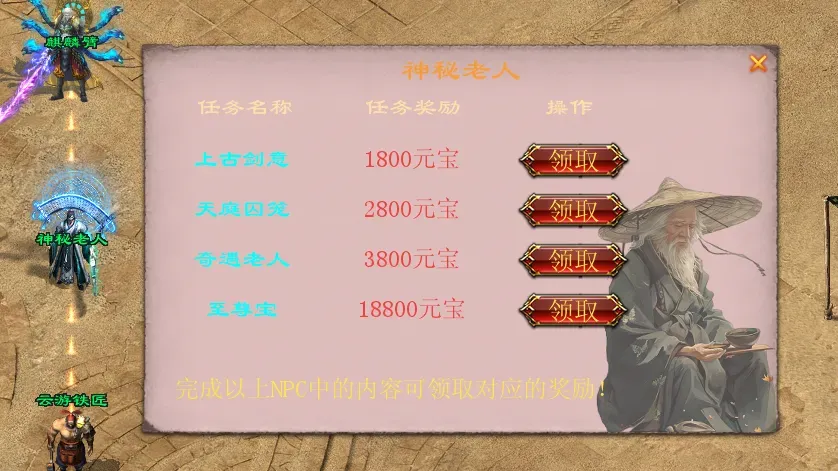 在沉沦之地/天荒之城/破碎的世界/宿命之城/无尽深渊安全区右侧神秘老人NPC处,完成当前大陆任务可领取对应数量的元宝。每个任务奖励仅可领取1次,不同的任务奖励的元宝数量也不同。