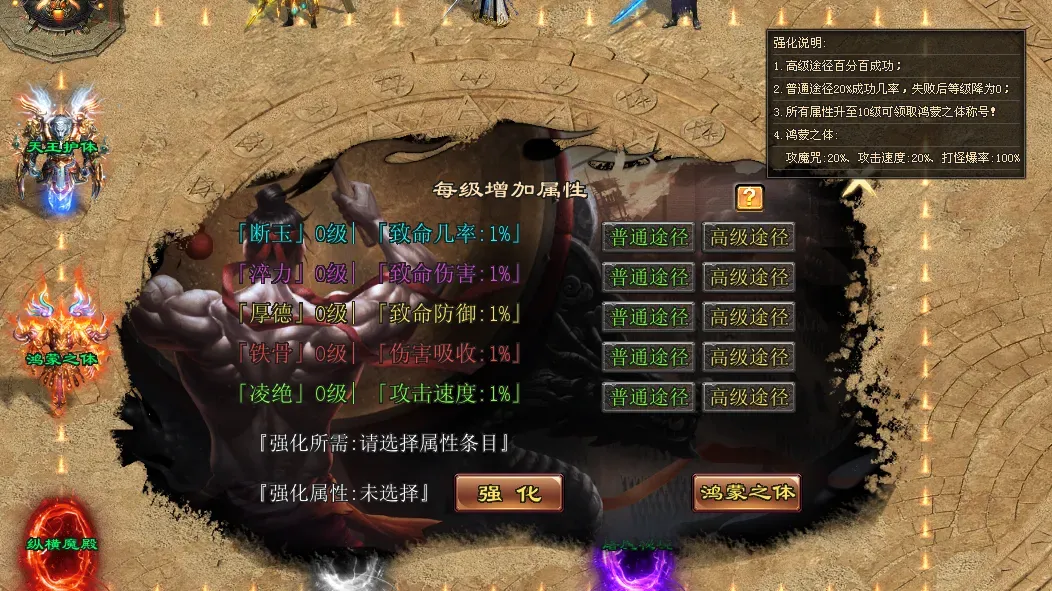 在破碎的世界安全区左侧鸿蒙之体NPC处,消耗魔神之血(击杀当前大陆怪物升级)、银子、元宝(高级途径)升级属性词条,可获得对应属性(致命几率/致命伤害/致命防御/伤害吸收/攻击速度)百分比加成。普通途径升级几率成功,失败后等级降为0级;高级途径升级100%成功。属性词条全部升级至10级可领取【鸿蒙之体】称号,获得攻魔咒+20%、攻击速度+20%、打怪爆率+100%。