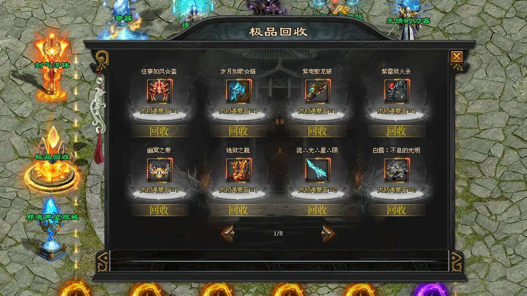 在无尽深渊安全区左侧极品回收NPC处,回收装备介绍含有“极品回收:无尽深渊”内容的极品装备,可获得对应数量的太初鸿蒙石。太初鸿蒙石是破极之境、五藏归元、剑甲天道等功能所需材料,也是许多装备锻造升级所需材料。除极品回收外,也可在破碎的世界BOSS积分商城兑换获取。