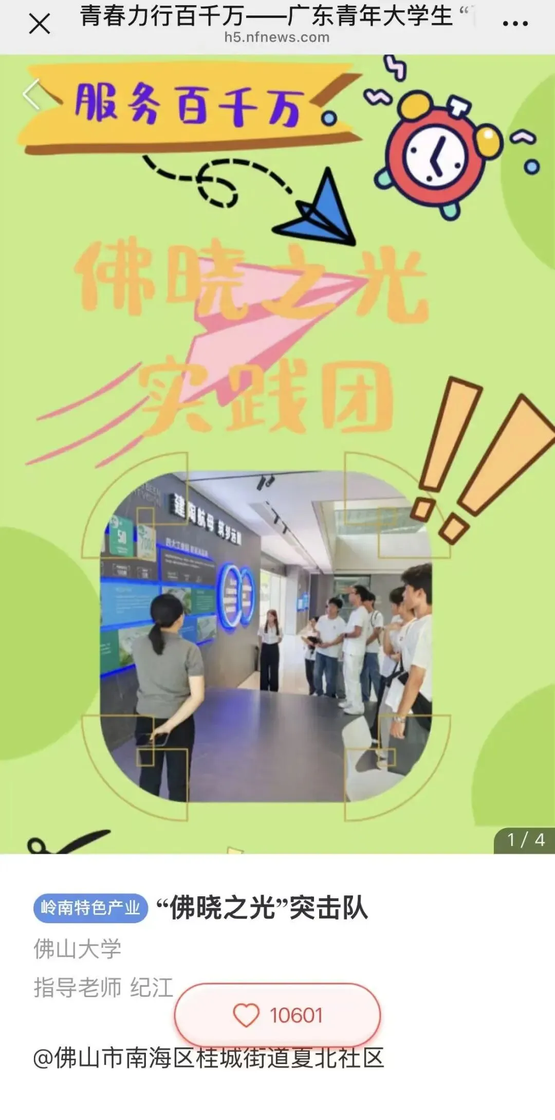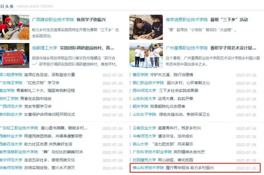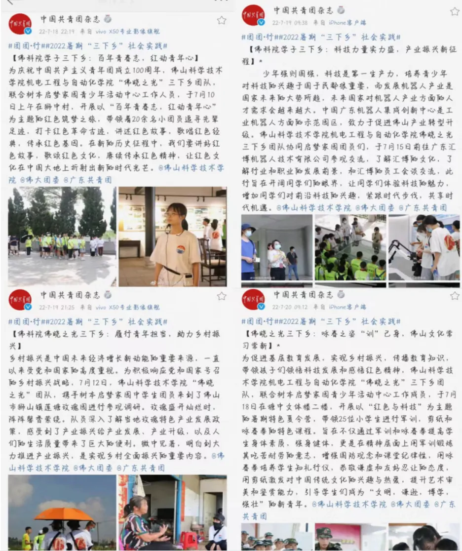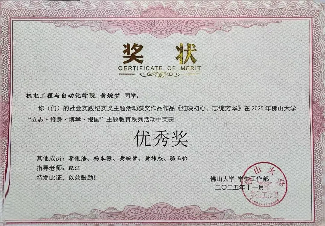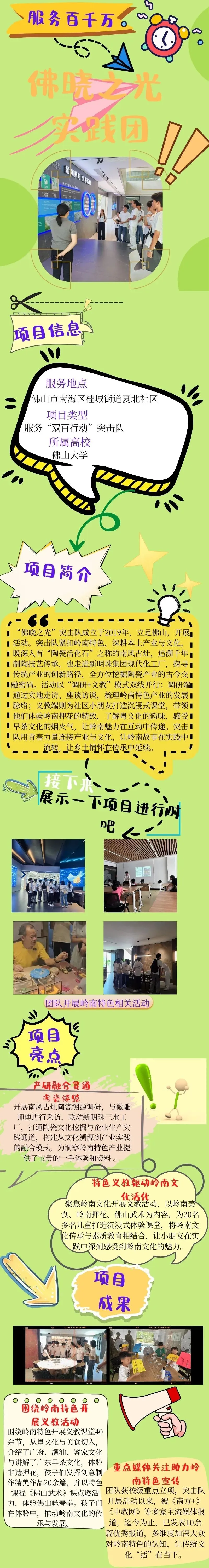 2025年,佛晓之光团队荣获校级重点立项,在2025年佛山大学“立志·修身·博学·报国”主题教育系列活动荣获优秀奖,佛晓之光团队制作的三下乡成果长图在南方日报展示,并获1W+点赞量。