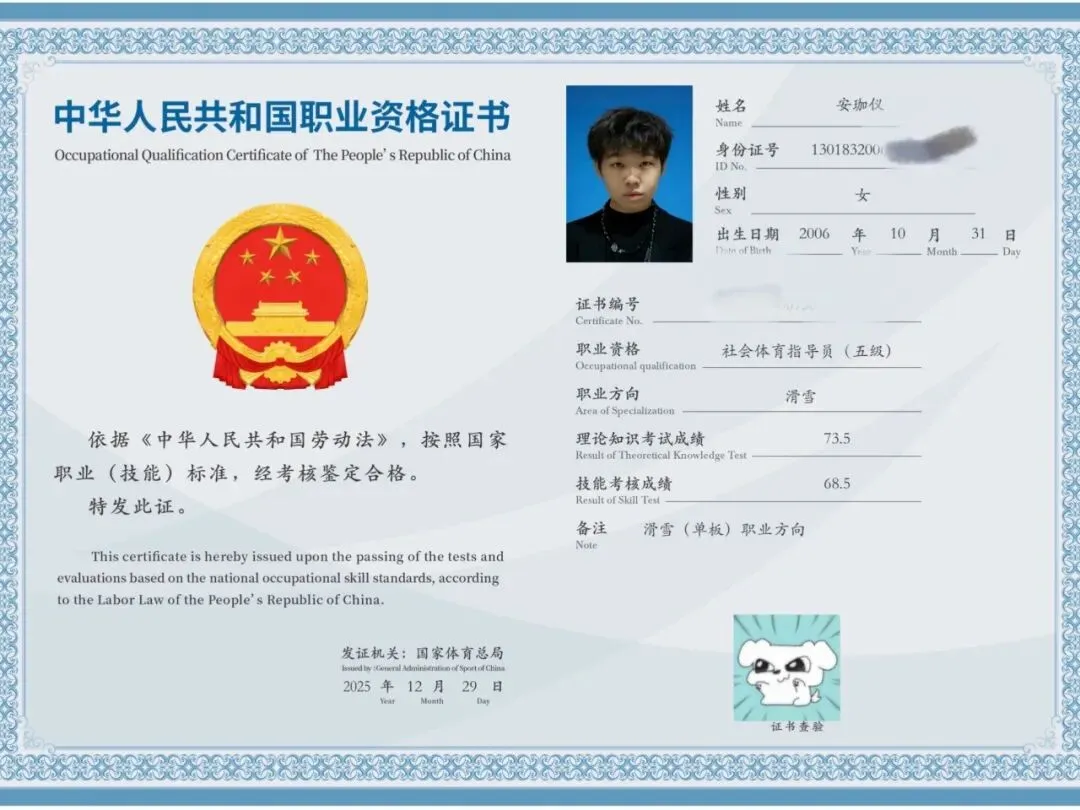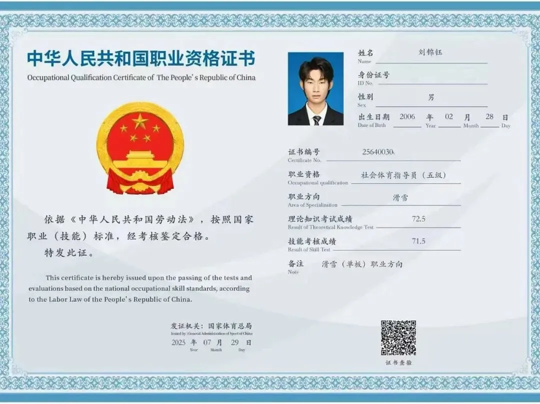 资格认证:2024级、2025级学生全员通过国家体育总局职业技能鉴定考试,获颁社会体育指导员(滑雪)五级国家职业资格证书,打通滑雪场一线教学的职业通道;