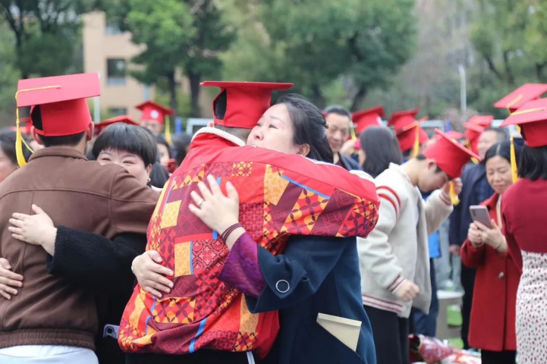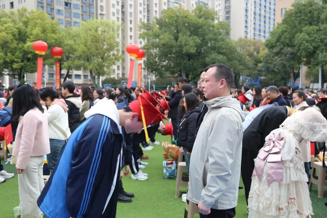 在“加冠仪式”环节,同学们向父母深深鞠躬:一鞠躬,感谢父母养育之恩;二鞠躬,铭记师长教诲之情;三鞠躬,立志担当家国重任。九十度的弯腰,是感恩的姿态,更是成长的宣言。父母们眼含热泪,轻轻为孩子整理衣冠,无声的拥抱传递着十八年养育的万千情愫。