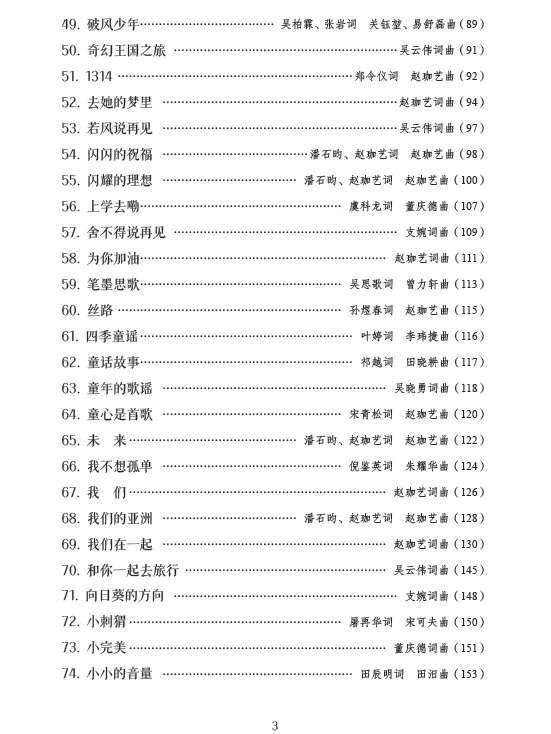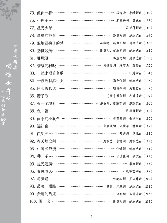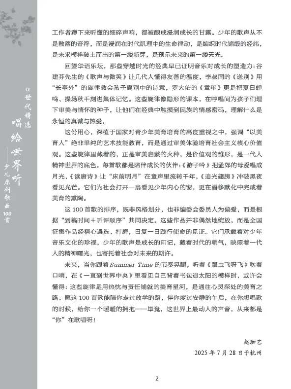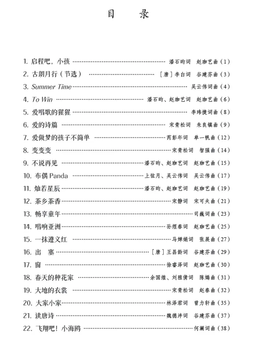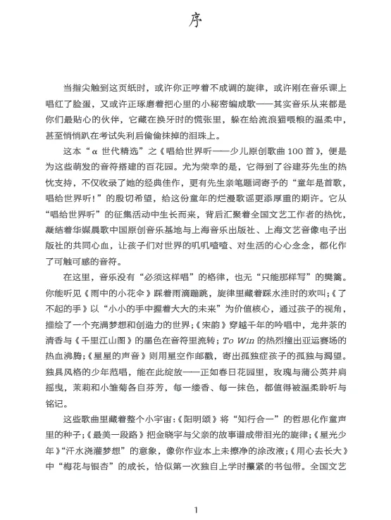 全书采用简谱记谱形式,清晰直观、易于识读,充分贴合儿童及青少年的音乐学习特点。这不仅是一部可供演唱实践的歌本,更是一套寓教于乐的美育教材,让孩子们在歌唱中陶冶情操、启迪心灵,在音符的滋养下快乐成长,让音乐梦想在童声飞扬中绽放光彩。