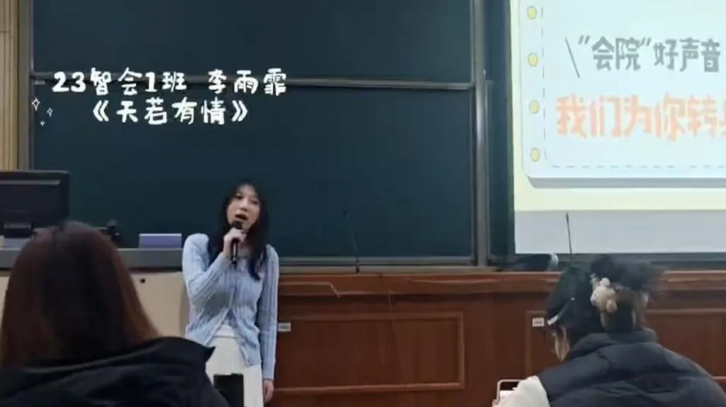 23智能会计1班 李雨霏(演唱歌曲:《天若有情》)以真诚之声诠释旋律,用深情演唱打动全场,她的歌声如温柔的晚风,拂过每一位听众的心底,成为舞台上最耀眼的星光。