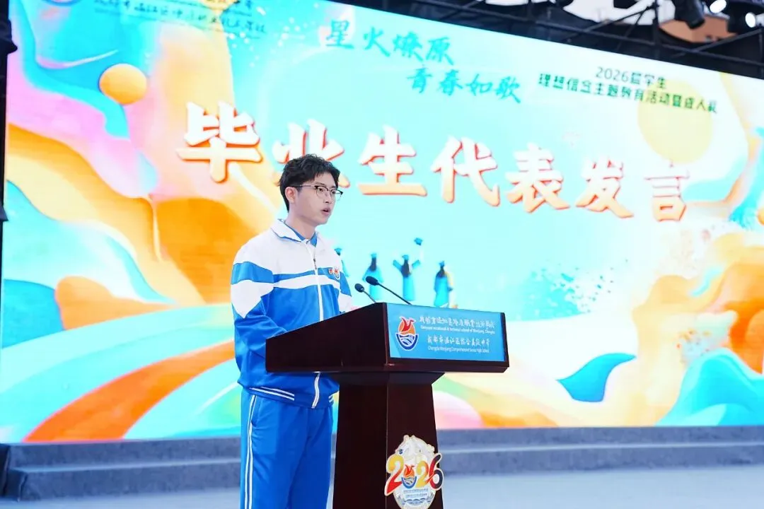 优秀毕业生代表胡声铄同学登台发言,他以真挚的话语回望了三年前初入校园的懵懂忐忑,细数了在课堂筑牢根基、在实训室打磨技能、在赛场奋力拼搏的青春时光。千言万语汇成满心感恩,他代表全体毕业生,向母校的悉心培育、师长的谆谆教诲、父母的默默守护、同窗的并肩相伴致以最诚挚的谢意,更许下郑重承诺:将带着母校的教诲与期许,秉持精益求精的工匠精神,在人生赛道上脚踏实地、向阳生长,以实际行动回报母校、回馈社会。