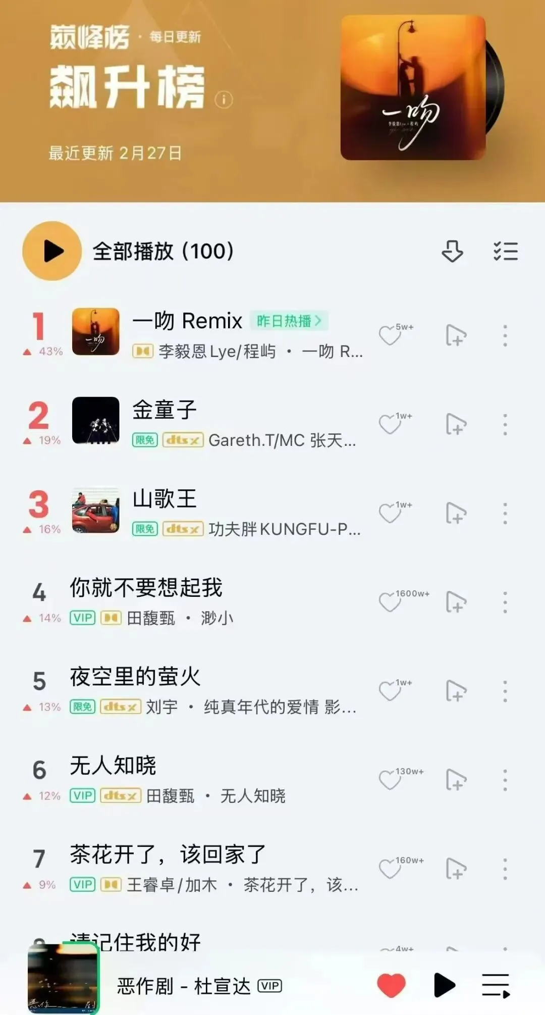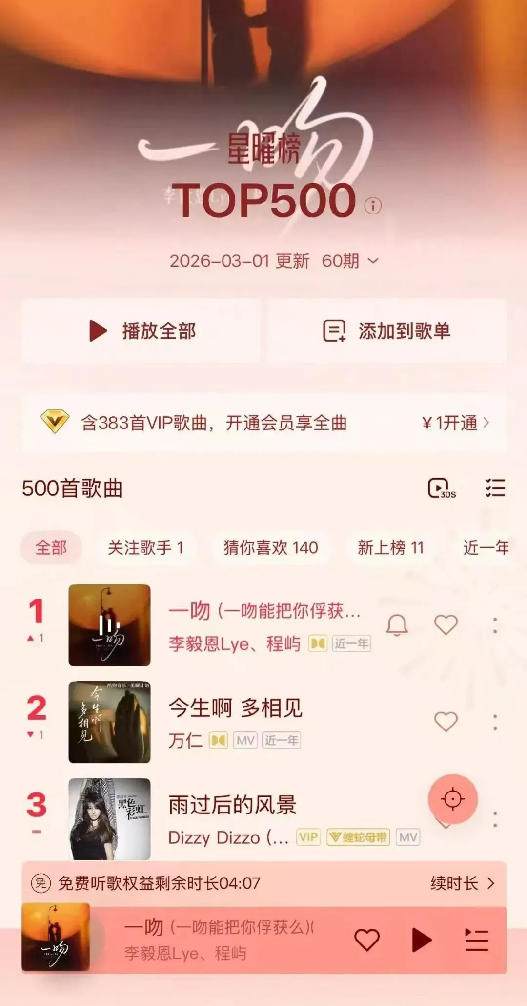 而更令人惊叹的是,他最近的作品《一吻》同时登顶九大音乐榜单,酷狗TOP500、飙升榜、90后热歌榜、00后热歌榜,网易云音乐的飙升榜和热搜榜——全部第一。在这个流量为王的时代,一位默默无闻的音乐素人,作品竟能与林俊杰等华语乐坛巨星同台竞技,甚至站在了最前面。